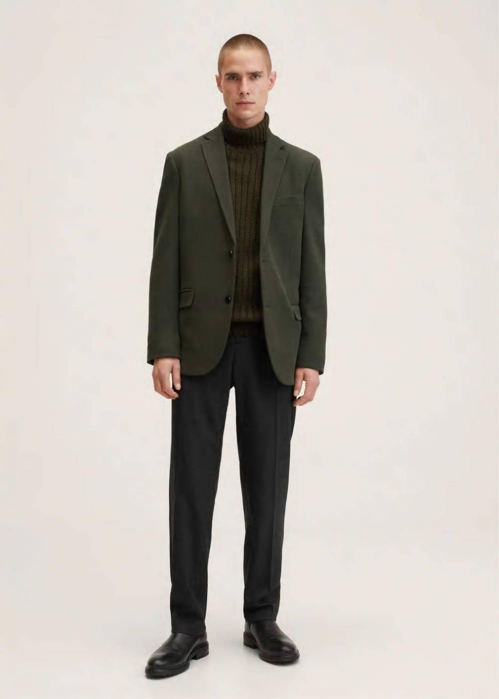 Slim fit Tejido mezcla de algodón Tejido con estructura Solapas con muesca Manga larga abotonada Bolsillo de ribete en el pecho Dos bolsillos de solapa laterales Doble abertura posterior Cierre de botones Forro interior Bolsillo interior El modelo mide 183 cm y lleva una talla 50 Las prendas etiquetadas como Committed son productos que han sido confeccionadas con fibras y/o procesos de producción sostenible, reduciendo así su impacto ambiental. El objetivo de Mango es respaldar la implementación de prácticas más comprometidas con el medio ambiente, aumentando así, el número de prendas sostenibles en su colección.