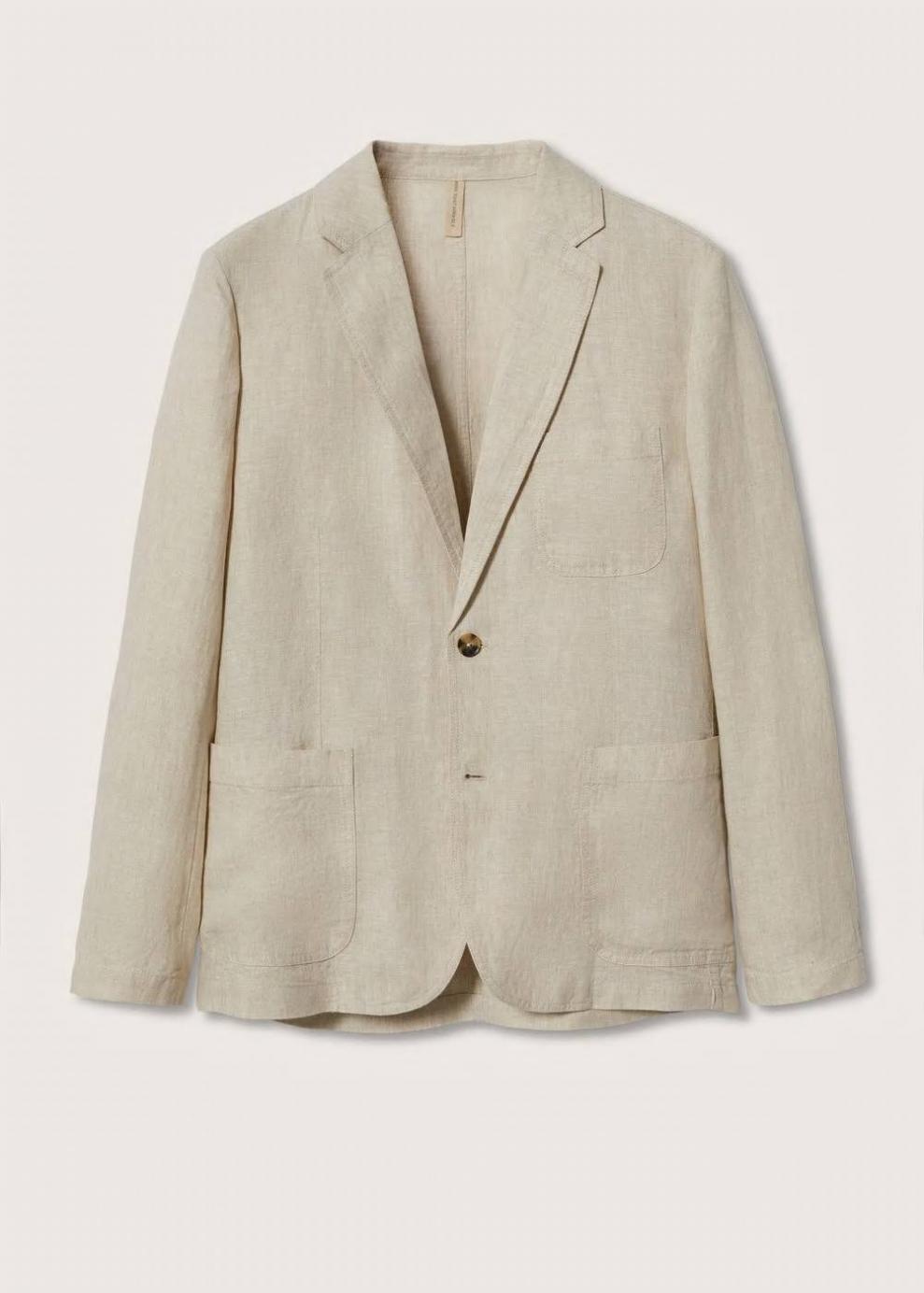 100% Lino Slim fit Solapas con muesca Tres bolsillos de parche Manga larga Cierre de botones en la parte delantera Diseño corto Sin forro interior