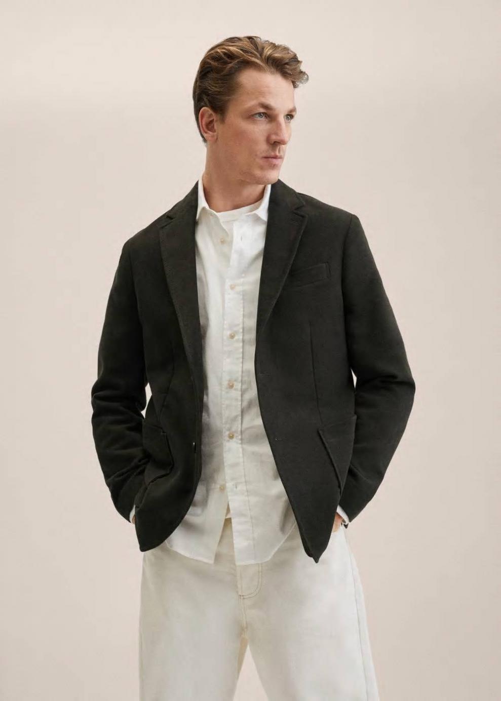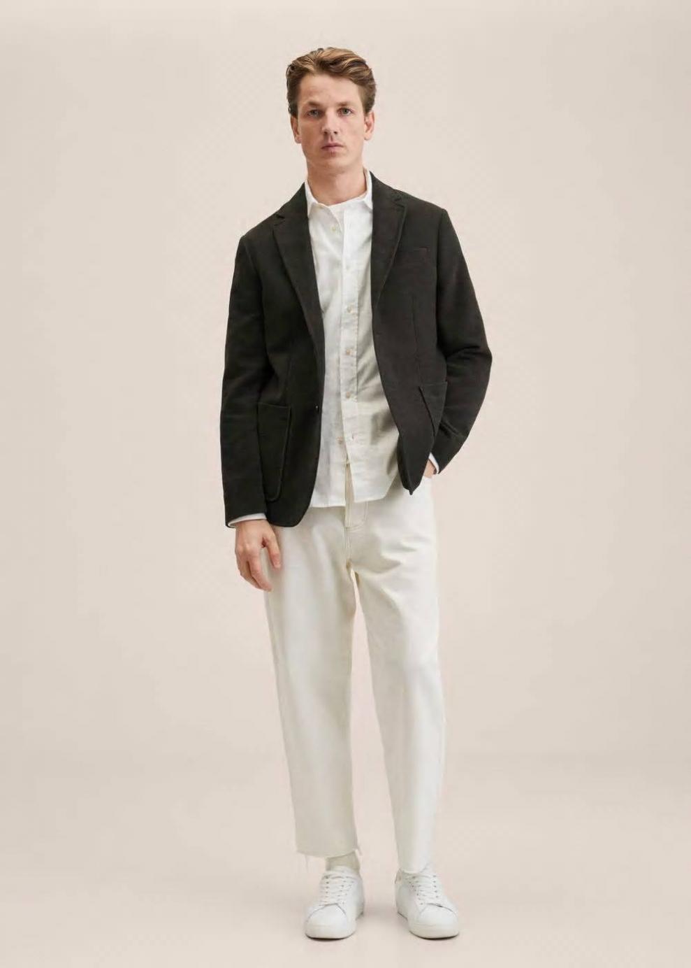 Slim fit Tejido de algodón sostenible Solapas con muesca Manga larga abotonada Bolsillo de ribete en el pecho Dos bolsillos de parche laterales Cierre de botones Forro interior Abertura posterior El modelo mide 185 cm y lleva una talla 50 Las prendas etiquetadas como Committed son productos que han sido confeccionadas con fibras y/o procesos de producción sostenible, reduciendo así su impacto ambiental. El objetivo de Mango es respaldar la implementación de prácticas más comprometidas con el medio ambiente, aumentando así, el número de prendas sostenibles en su colección.