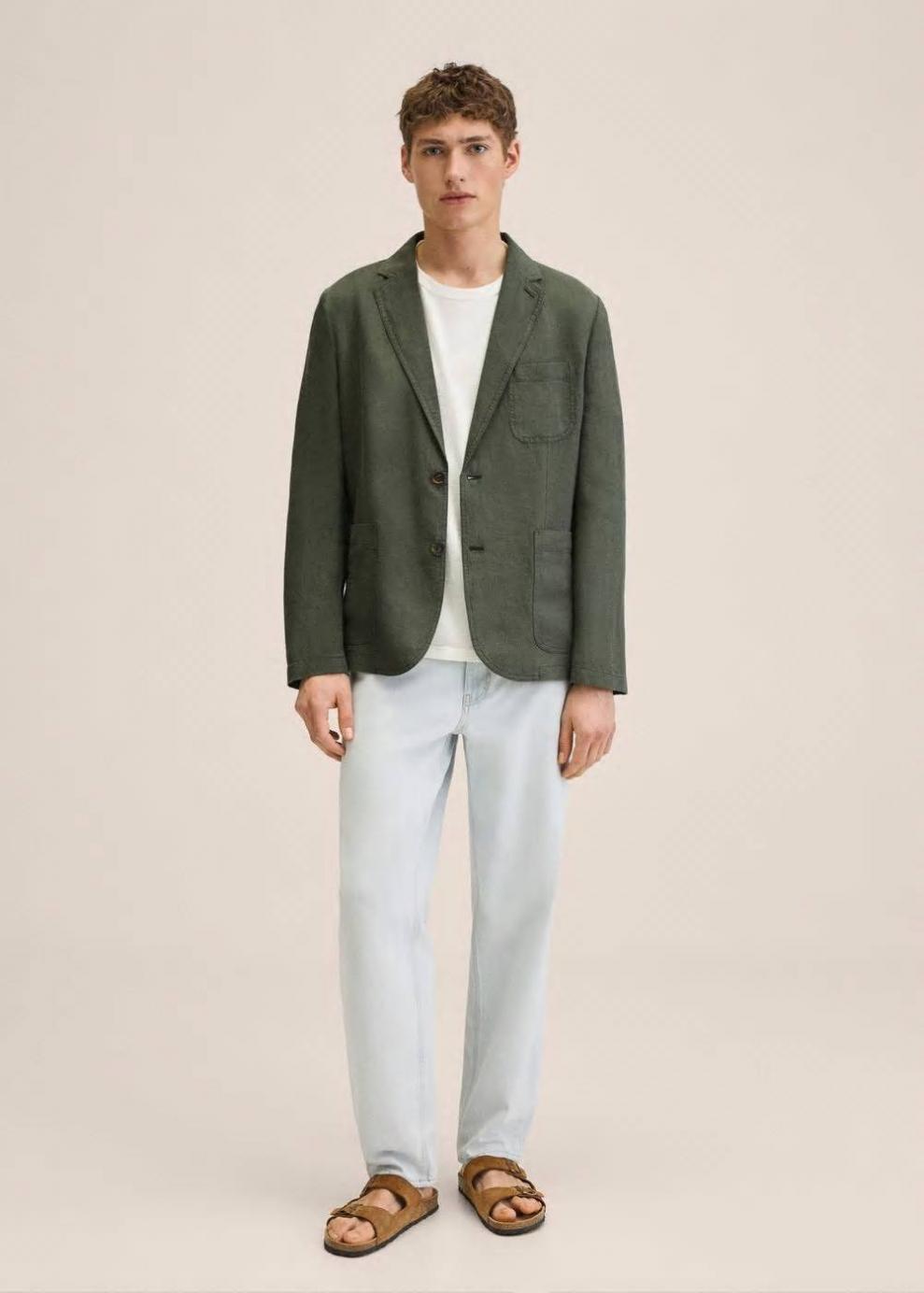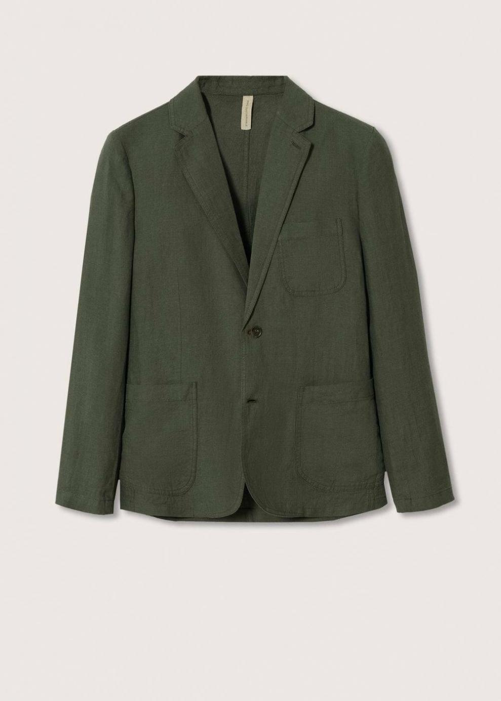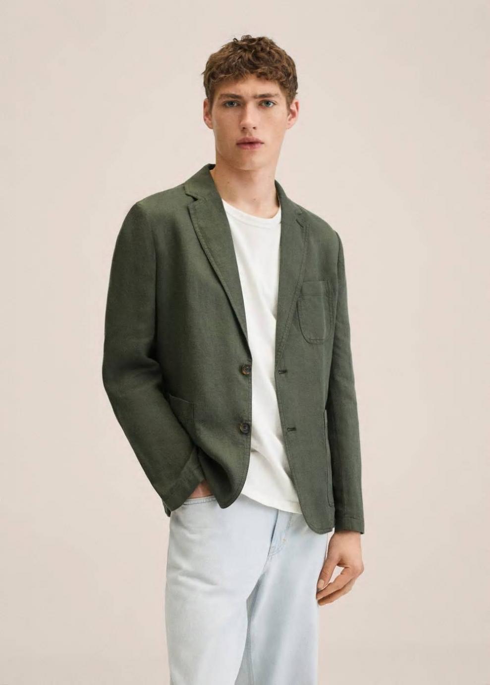 100% Lino Slim fit Solapas con muesca Tres bolsillos de parche Manga larga Cierre de botones en la parte delantera Diseño corto Sin forro interior El modelo mide 185 cm y lleva una talla 50