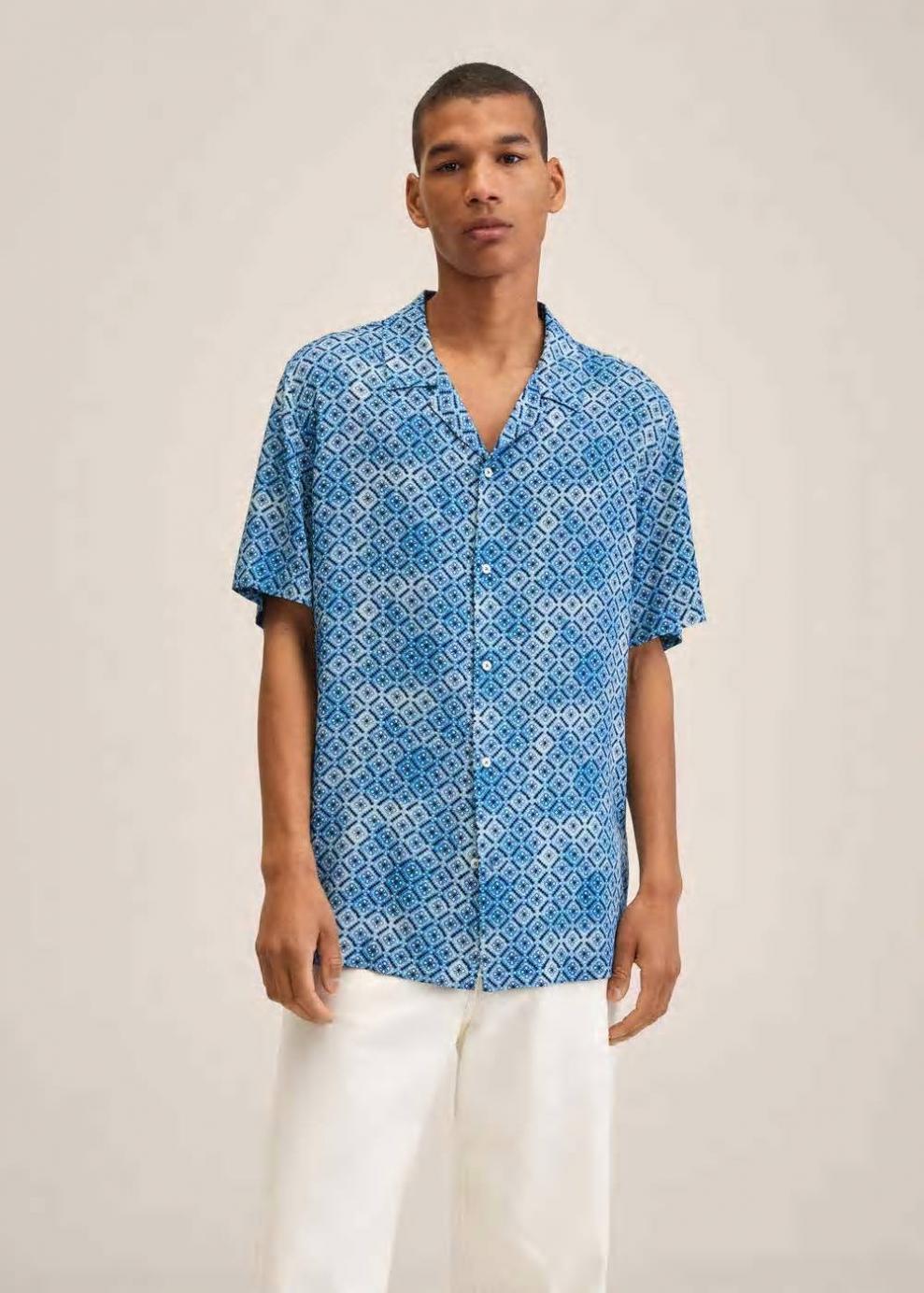 Diseño estampado Regular fit Tejido fluido Cuello bowling Manga corta Cierre de botones El modelo mide 185 cm y lleva una talla M