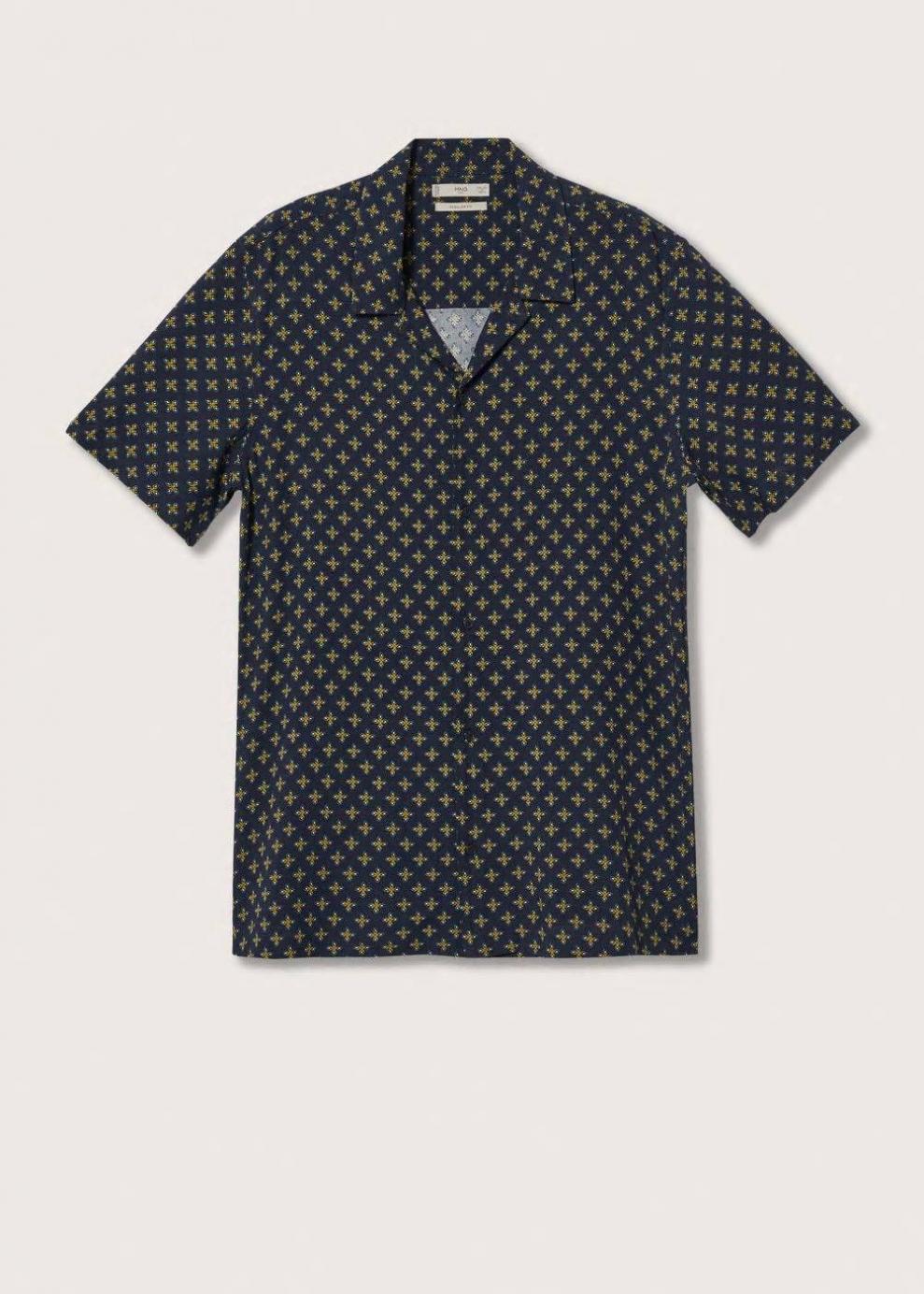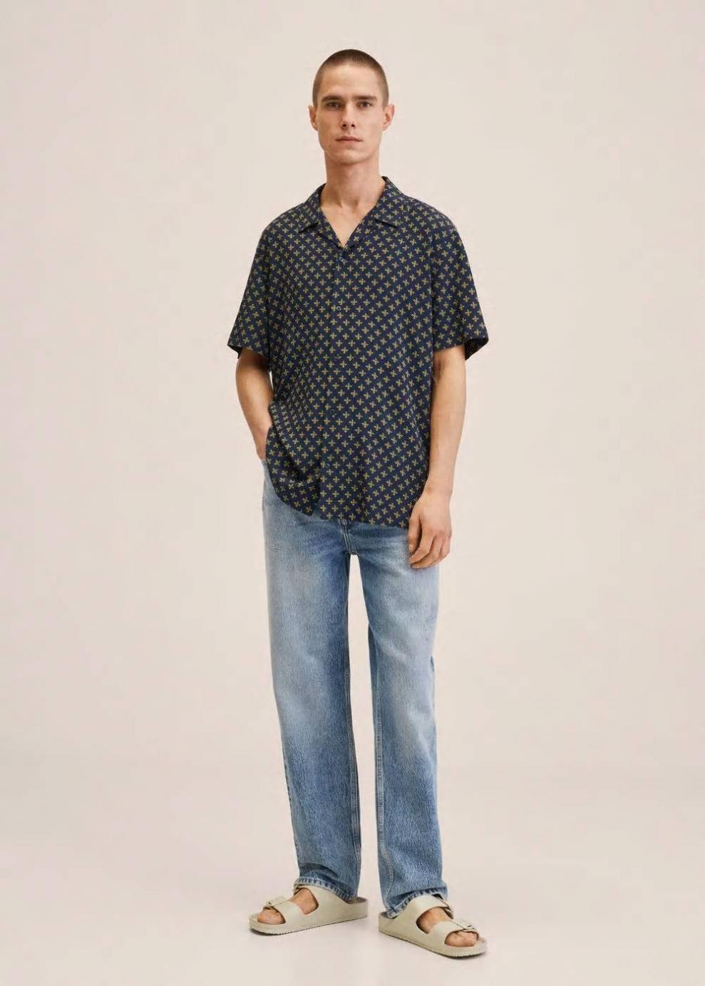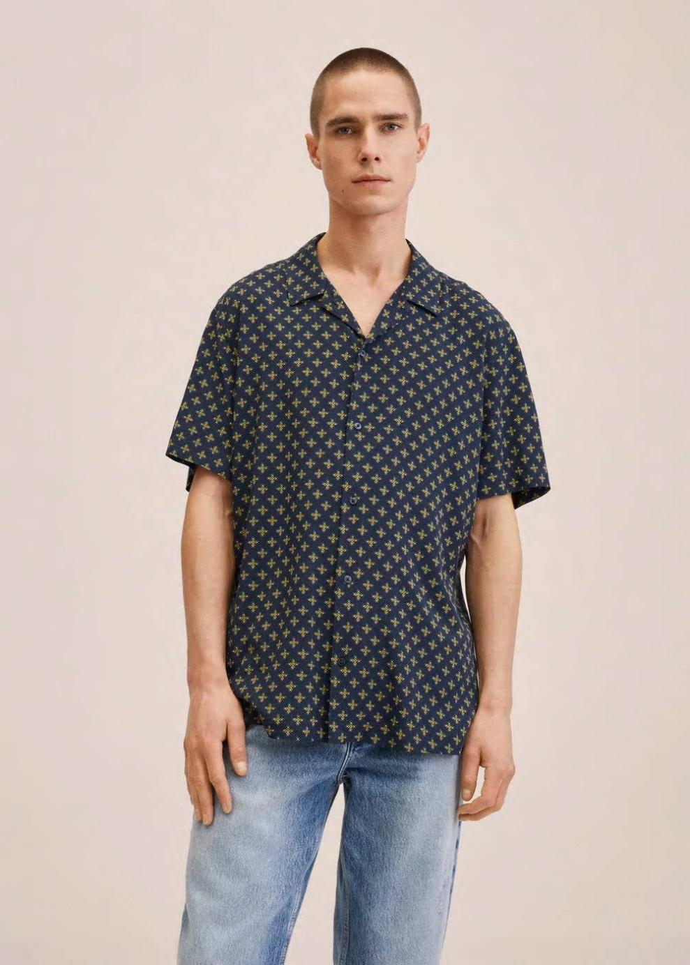 Diseño estampado Regular fit Tejido fluido Cuello bowling Manga corta Cierre de botones El modelo mide 183 cm y lleva una talla M