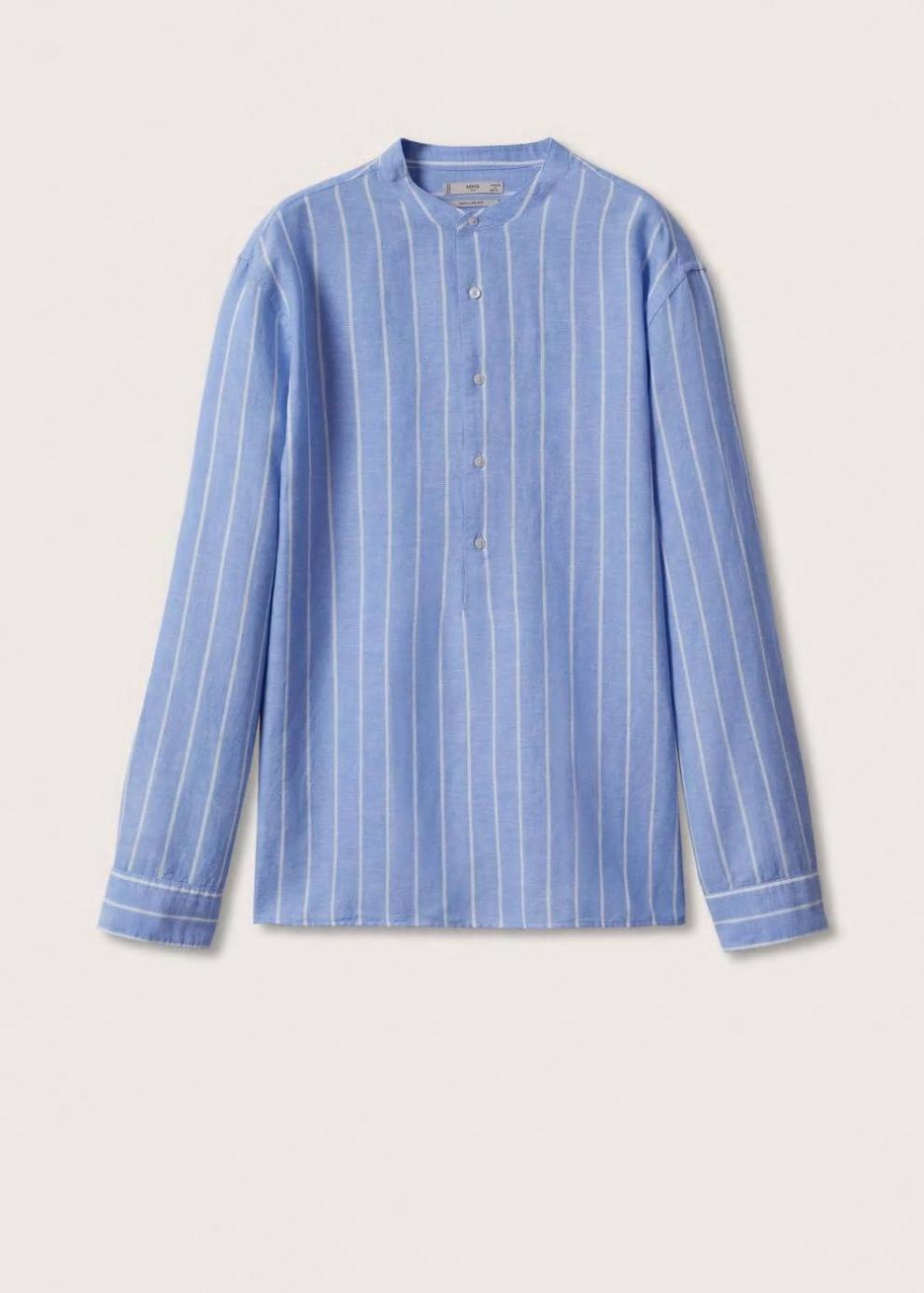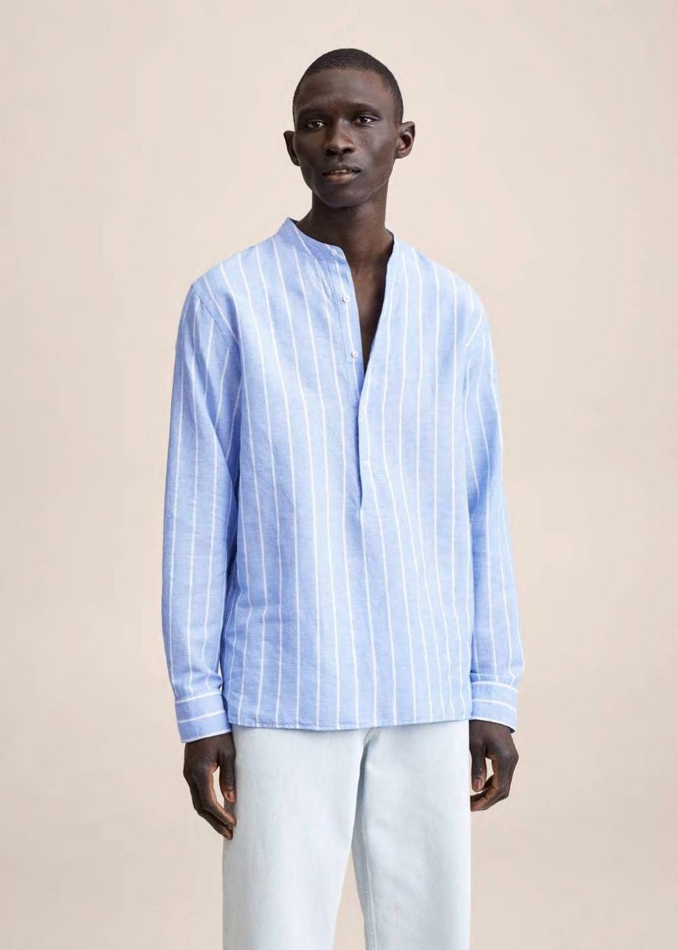 Regular fit Diseño de rayas Tejido mezcla de algodón y lino Cuello mao Manga larga Cierre de botones El modelo mide 190 cm y lleva una talla M Las prendas etiquetadas como Committed son productos que han sido confeccionadas con fibras y/o procesos de producción sostenible, reduciendo así su impacto ambiental. El objetivo de Mango es respaldar la implementación de prácticas más comprometidas con el medio ambiente, aumentando así, el número de prendas sostenibles en su colección.