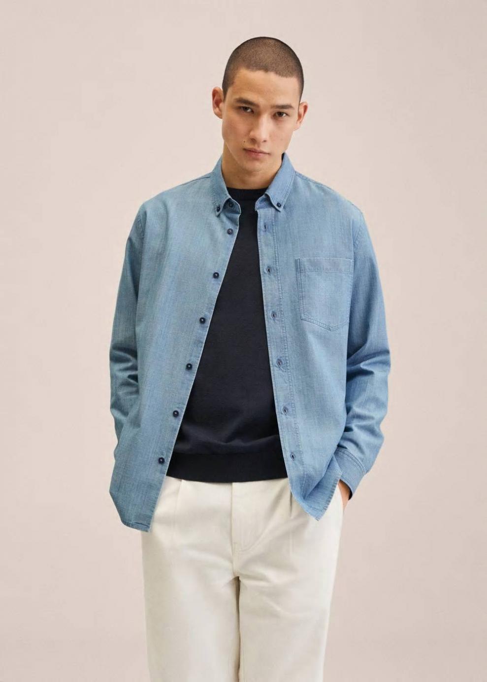 Diseño vaquero Regular fit Tejido mezcla algodón y lyocell Cuello abotonado Manga larga abotonada Bolsillo de parche en el pecho Cierre de botones El modelo mide 185 cm y lleva una talla M Las prendas etiquetadas como Committed son productos que han sido confeccionadas con fibras y/o procesos de producción sostenible, reduciendo así su impacto ambiental. El objetivo de Mango es respaldar la implementación de prácticas más comprometidas con el medio ambiente, aumentando así, el número de prendas sostenibles en su colección.