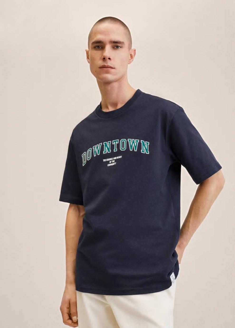 Diseño varsity Regular fit Tejido de algodón sostenible Cuello redondo Manga corta Diseño estampado en el pecho El modelo mide 183 cm y lleva una talla M