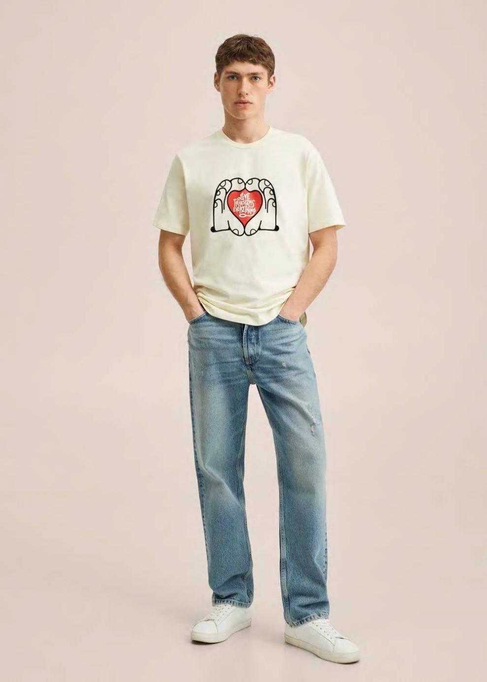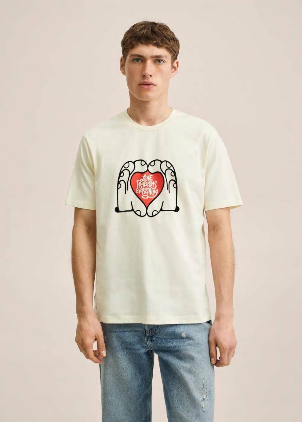 Colección Cápsula Dirty x Mango Regular fit Tejido de algodón sostenible Diseño estampado de terciopelo Cuello redondo Manga corta El modelo mide 185 cm y lleva una talla M Dirty es un artista barcelonés emergente con el que nos une el vínculo Mediterráneo, la naturaleza y el respeto hacia ella. Los diseños de Dirty para Mango están cargados de mensajes estimulantes que hablan de creatividad, ausencia de límites y del amor como valor supremo al tiempo.
