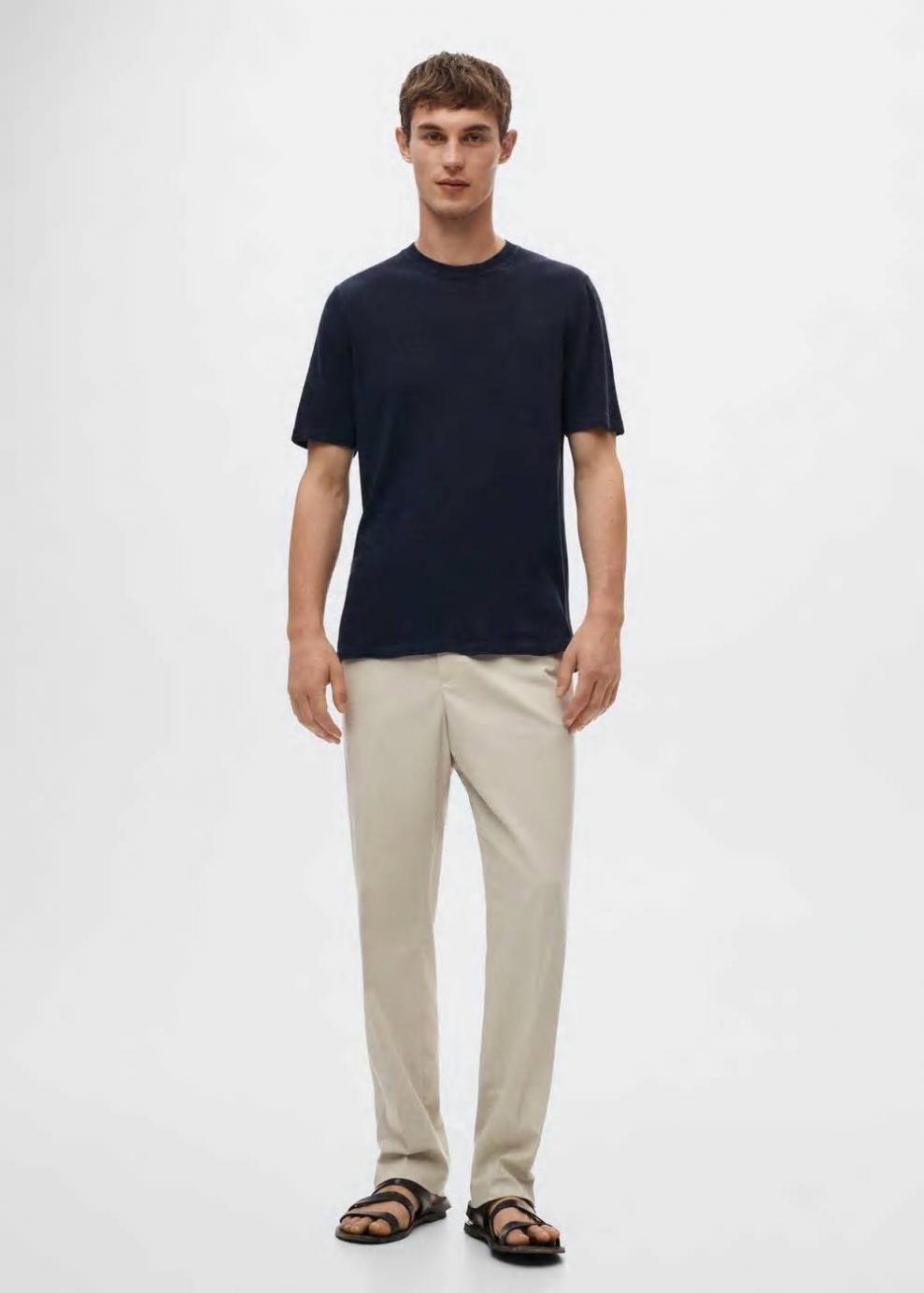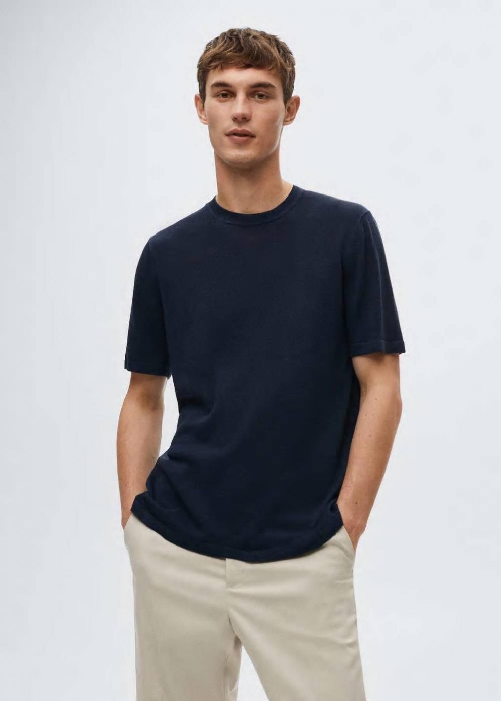 Tejido de punto fino Tejido mezcla de lino Cuello redondo Manga corta El modelo mide 187 cm y lleva una talla M Las prendas etiquetadas como Committed son productos que han sido confeccionadas con fibras y/o procesos de producción sostenible, reduciendo así su impacto ambiental. El objetivo de Mango es respaldar la implementación de prácticas más comprometidas con el medio ambiente, aumentando así, el número de prendas sostenibles en su colección.
