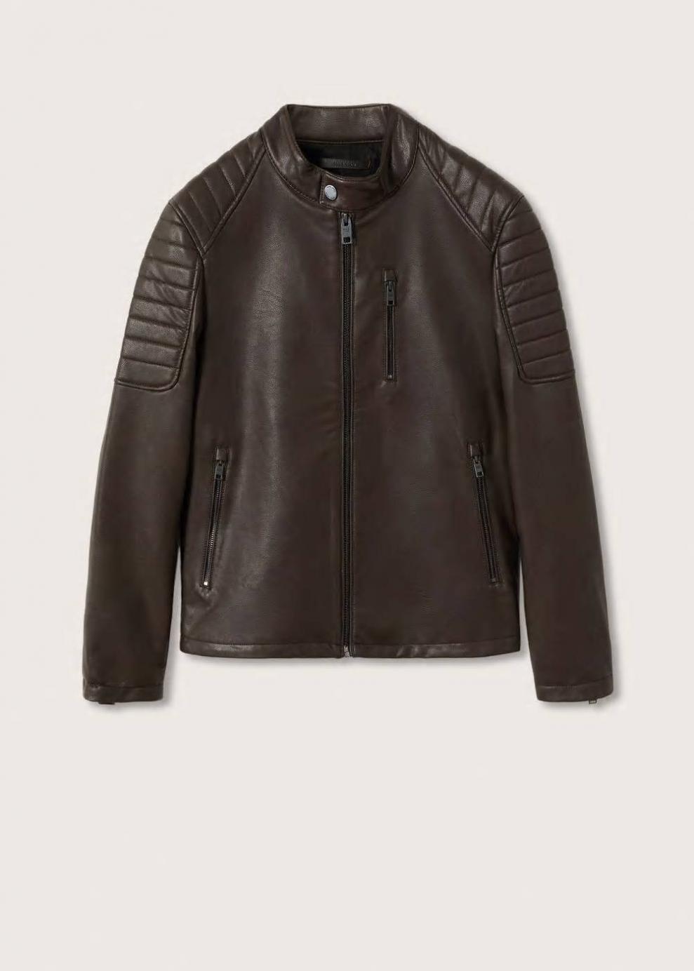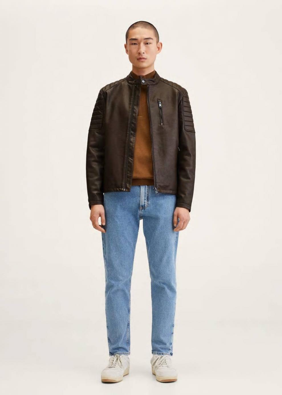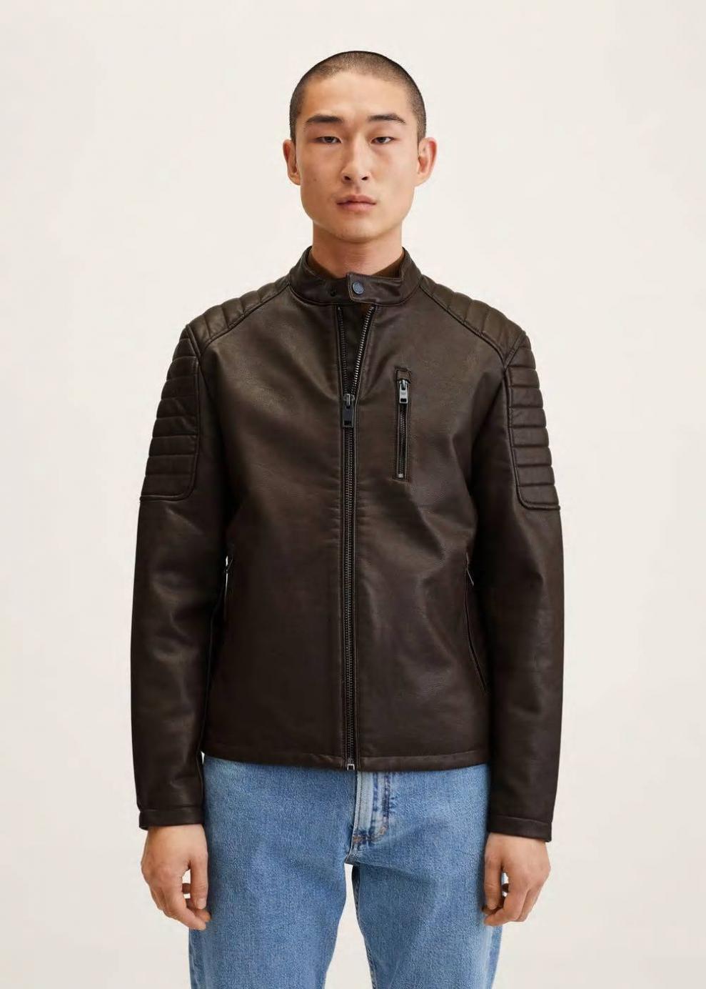 Diseño biker Diseño corto Efecto piel Cuello redondo con cierre de botón Bolsillo de cremallera en el pecho Manga larga con cremallera Bolsillos de cremallera en la parte delantera Cierre de cremallera Forro interior El modelo mide 183 cm y lleva una talla M