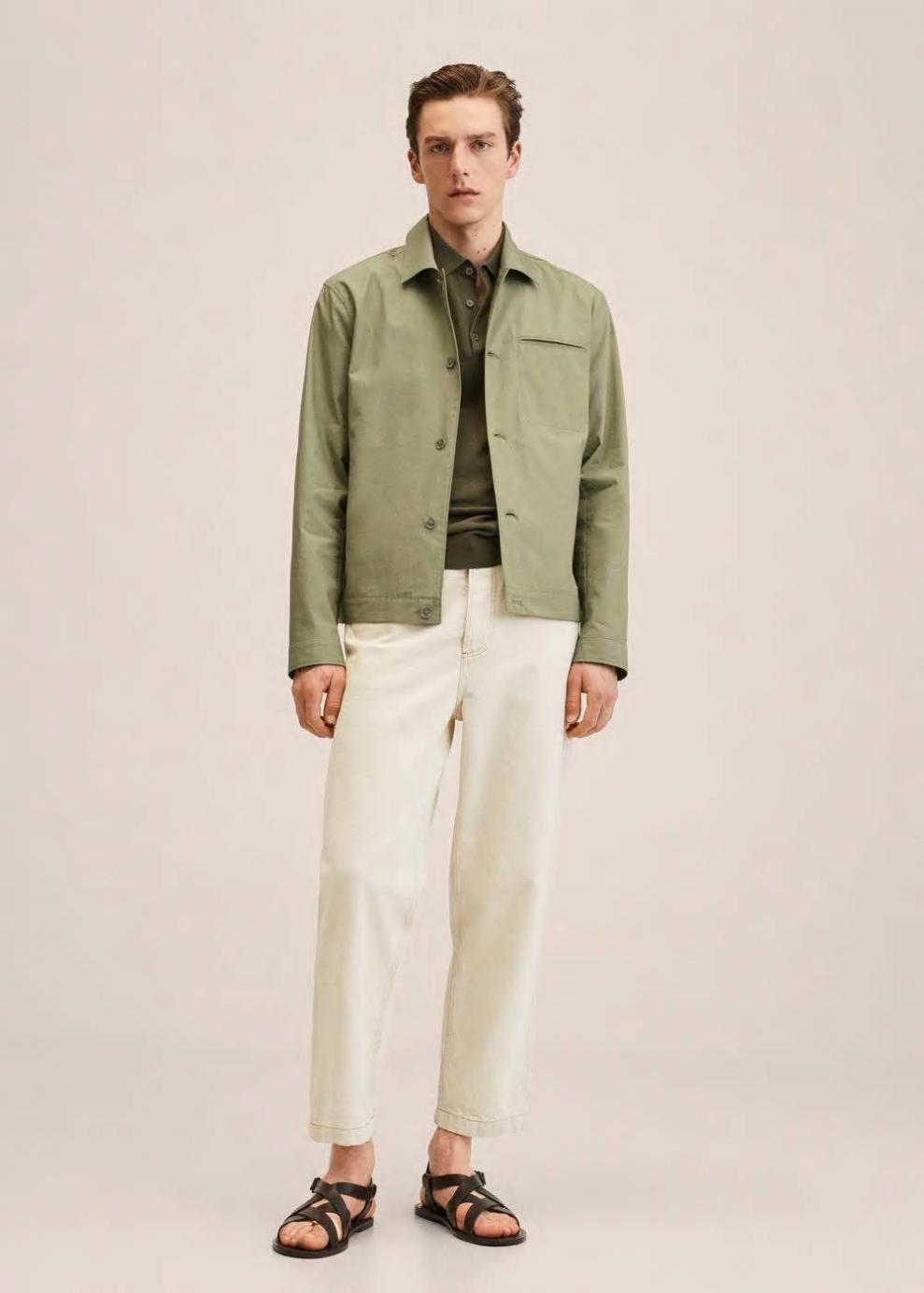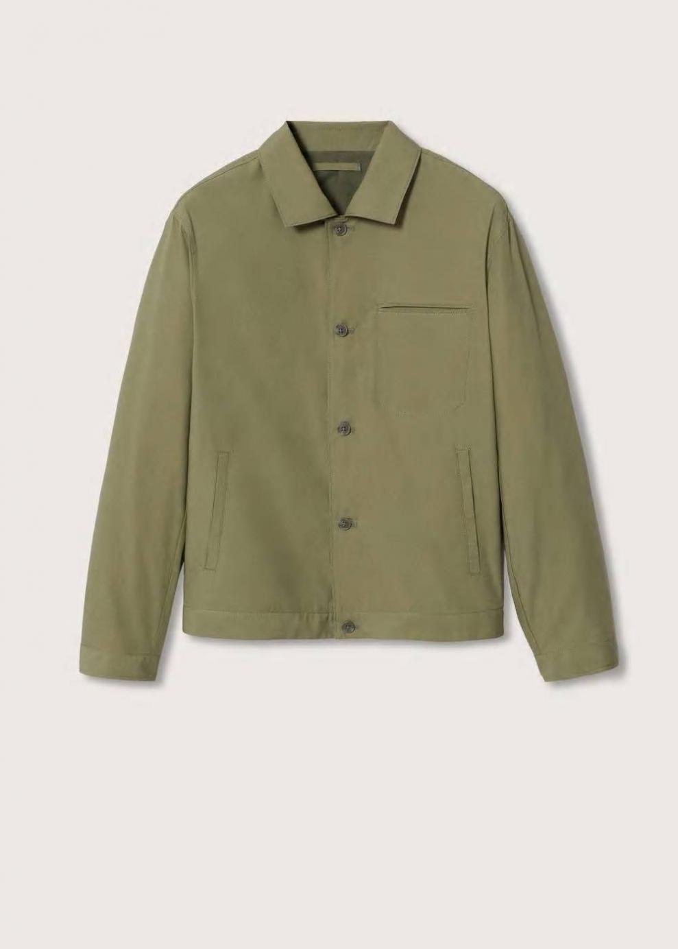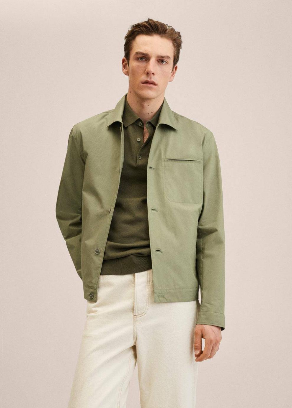 Diseño corto Tejido de algodón Tejido ligero Cuello camisero Manga larga Dos bolsillos laterales Bolsillo de ribete en el pecho Sin forro interior Cierre de botones El modelo mide 187 cm y lleva una talla M