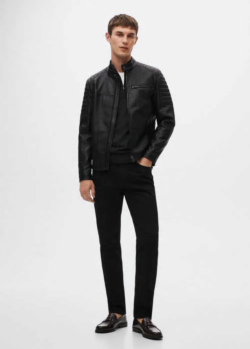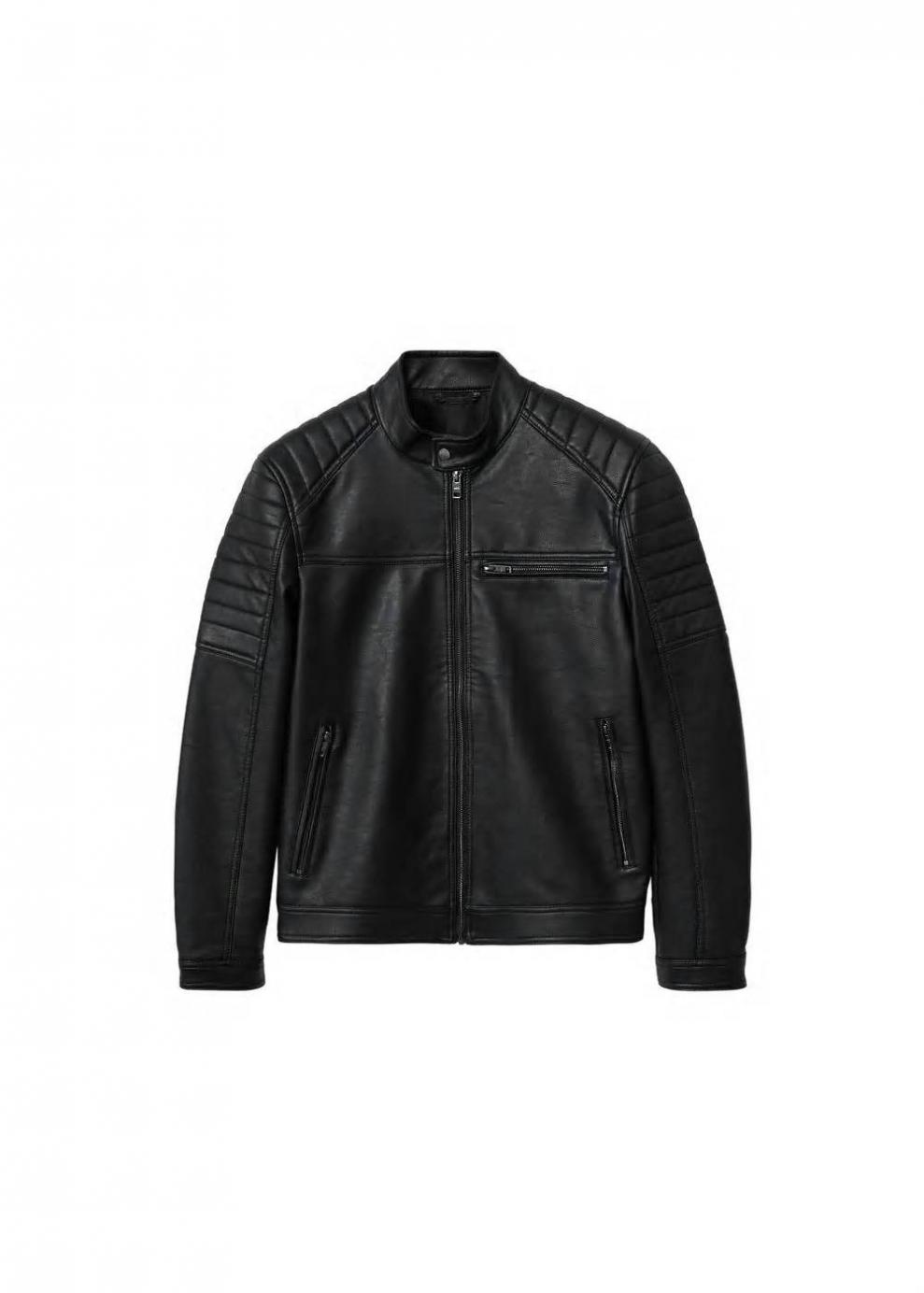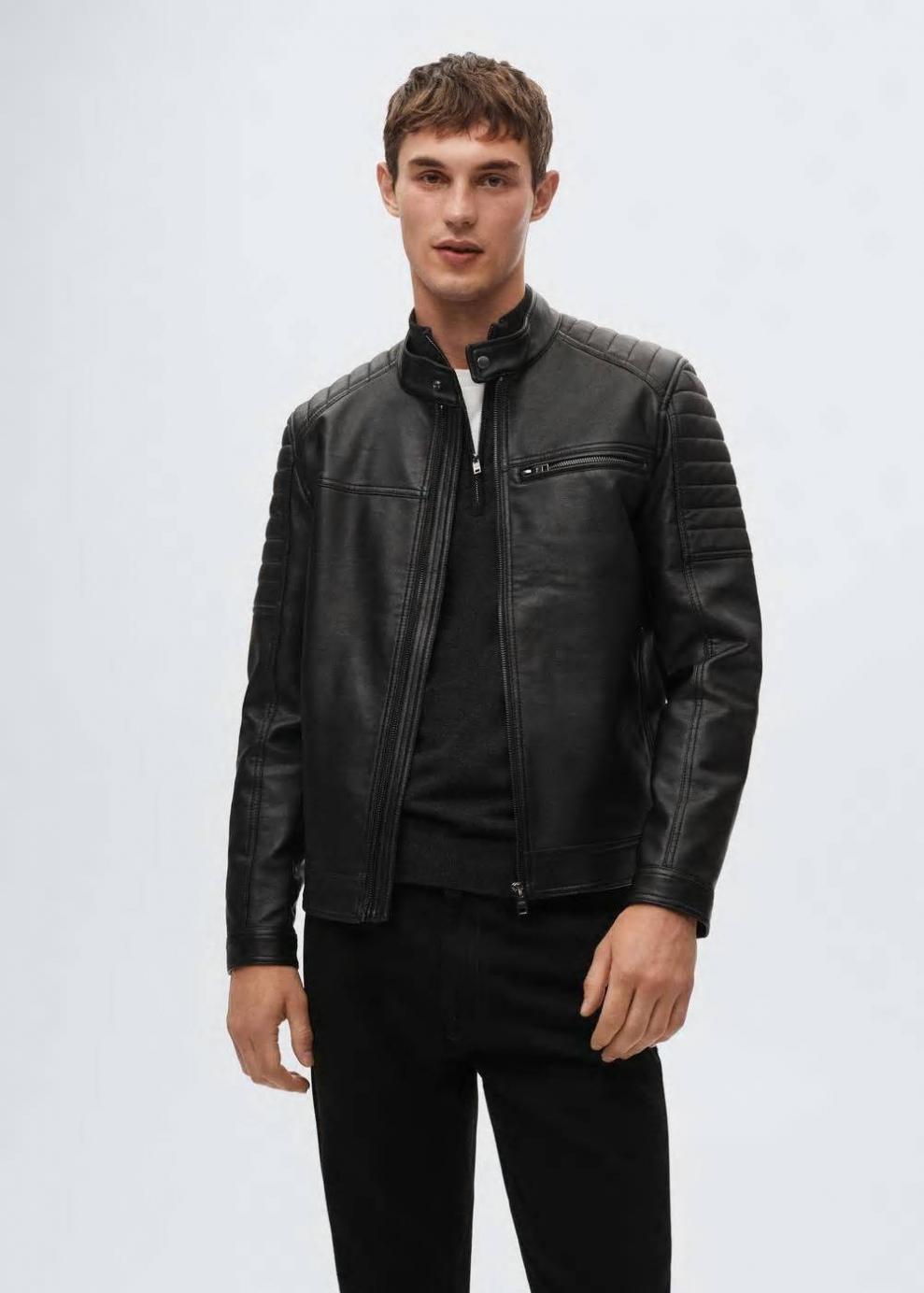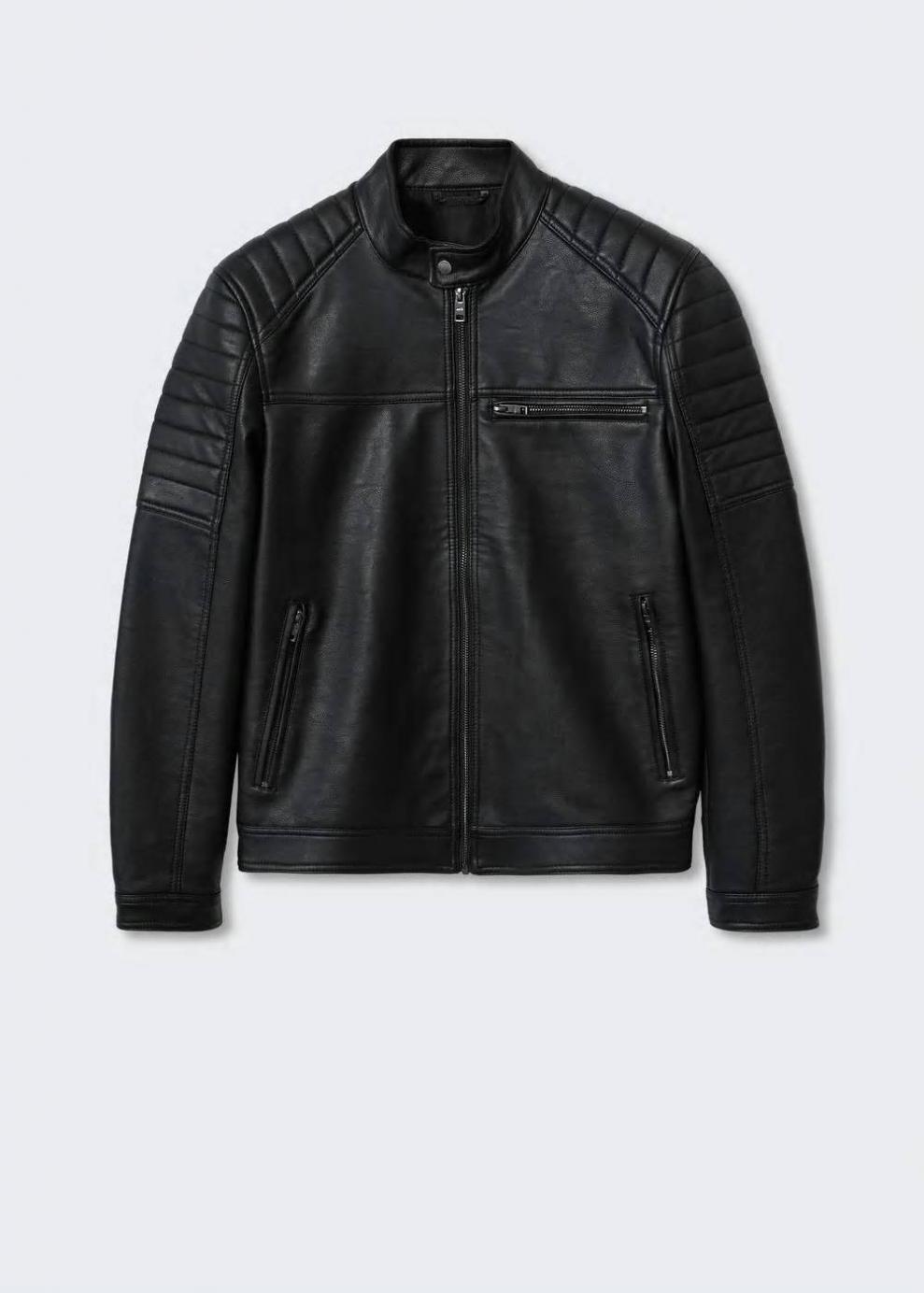 Efecto piel Diseño biker Cuello alto Cierre de botón a presión en el cuello Manga larga Bolsillo de cremallera en el pecho Dos bolsillos laterales de cremallera Cierre de cremallera Forro interior Bolsillo interior El modelo mide 187 cm y lleva una talla M