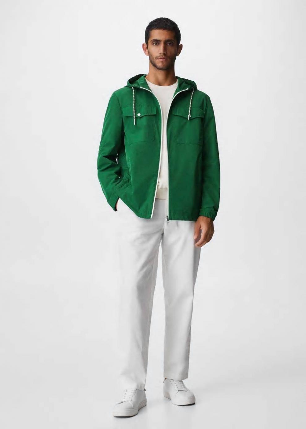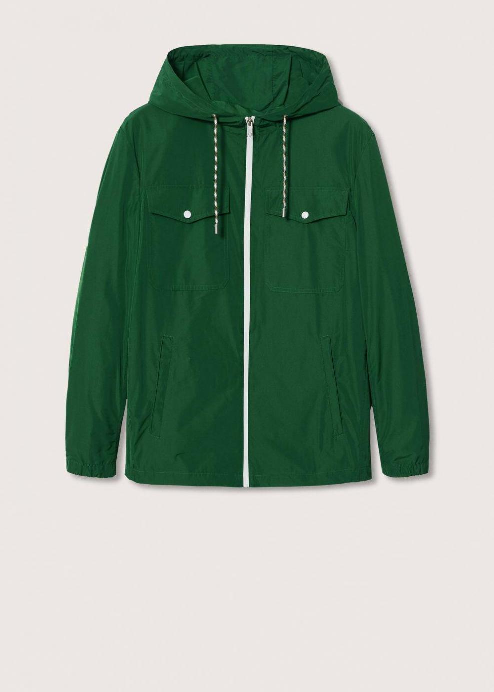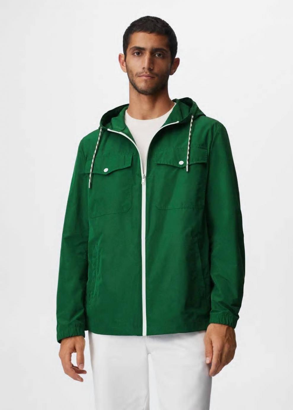Diseño corto Water Repellent: Tejido técnico repelente al agua Capucha con cordón ajustable Dos bolsillos de solapa con botón en el pecho Dos bolsillos laterales Cierre de cremallera Bolsillo interior
