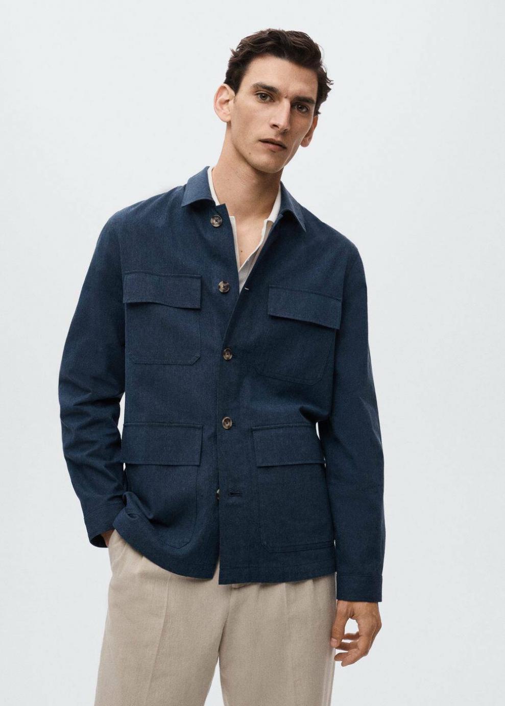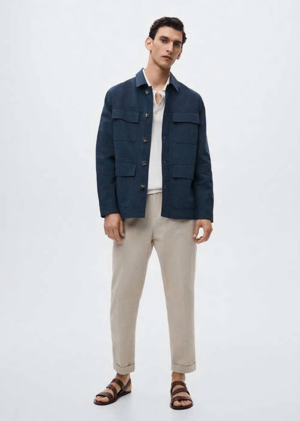 Estilo sahariana Diseño medio Tejido mezcla de algodón y lino Cuello clásico Manga larga Cuatro bolsillos de solapa en la parte delantera Cierre de botones El modelo mide 187 cm y lleva una talla M Las prendas etiquetadas como Committed son productos que han sido confeccionadas con fibras y/o procesos de producción sostenible, reduciendo así su impacto ambiental. El objetivo de Mango es respaldar la implementación de prácticas más comprometidas con el medio ambiente, aumentando así, el número de prendas sostenibles en su colección.