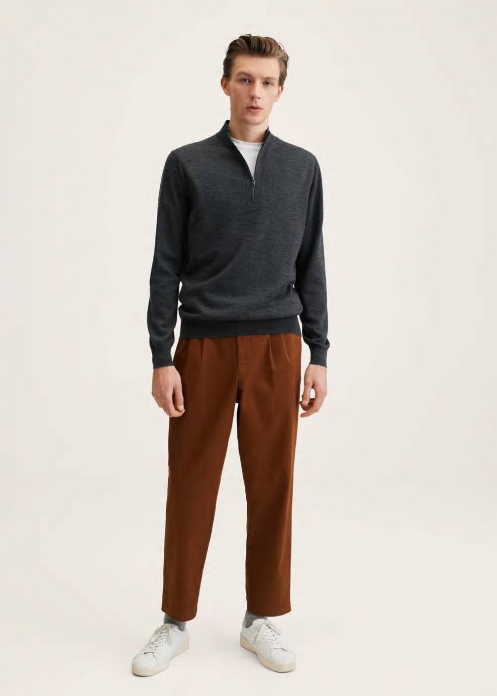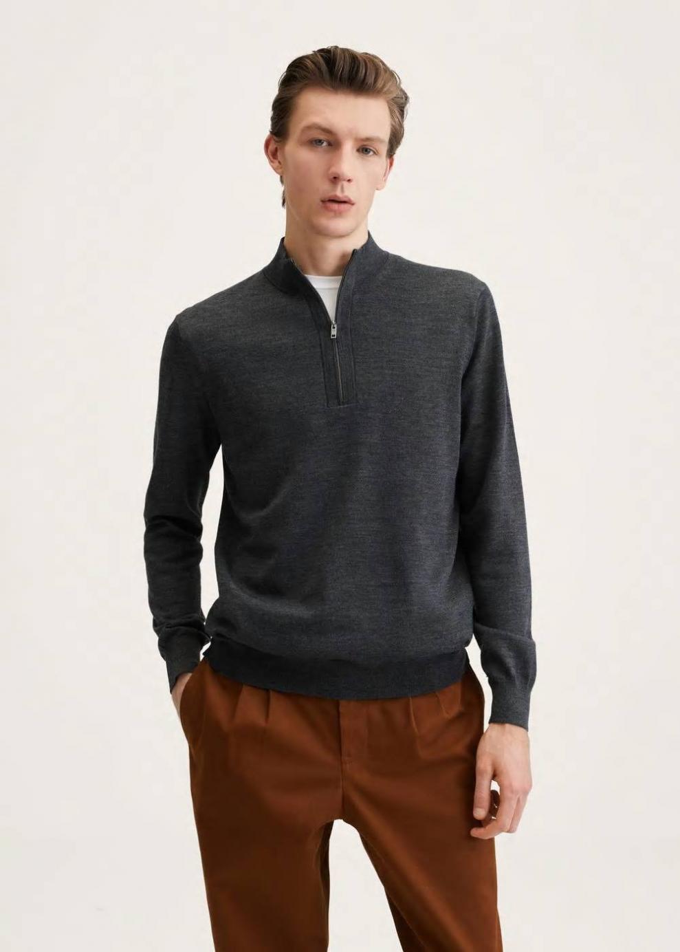 Diseño estándar Cierre delantero Cuello perkins Slim fit 100% lana Tejido de punto fino Cuello perkins con cremallera Manga larga Terminaciones elásticas en canalé