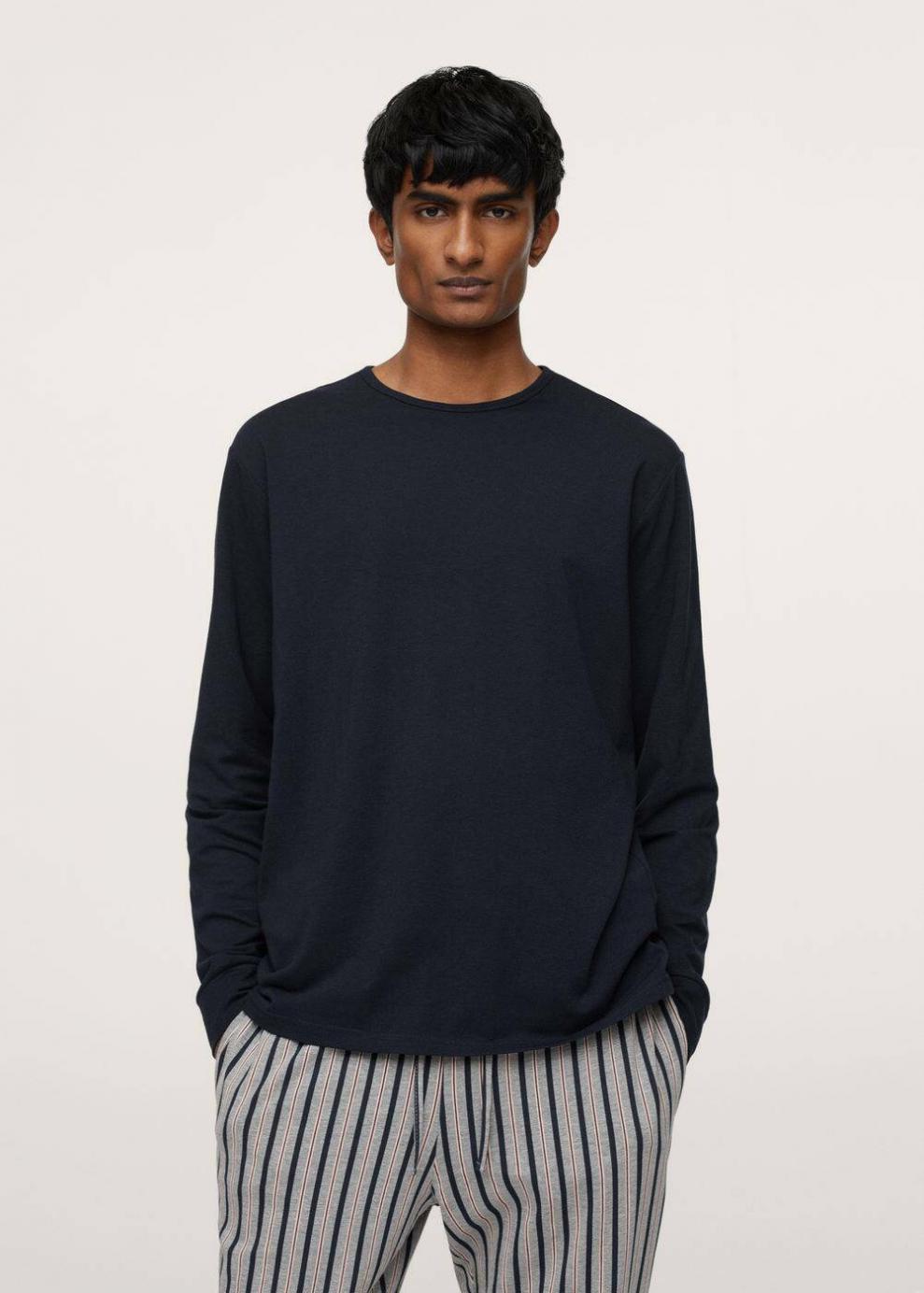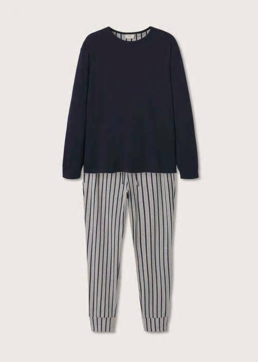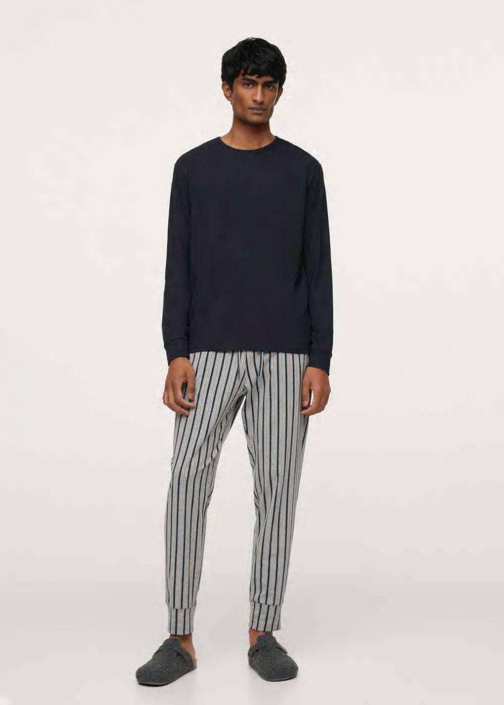 Pack de camiseta y pantalón de pijama Tejido mezcla de algodón Camiseta de manga larga Cuello redondo Pantalón largo de rayas Cintura con cordón ajustable Dos bolsillos laterales El modelo mide 190 cm y lleva una talla M Las prendas etiquetadas como Committed son productos que han sido confeccionadas con fibras y/o procesos de producción sostenible, reduciendo así su impacto ambiental. El objetivo de Mango es respaldar la implementación de prácticas más comprometidas con el medio ambiente, aumentando así, el número de prendas sostenibles en su colección.