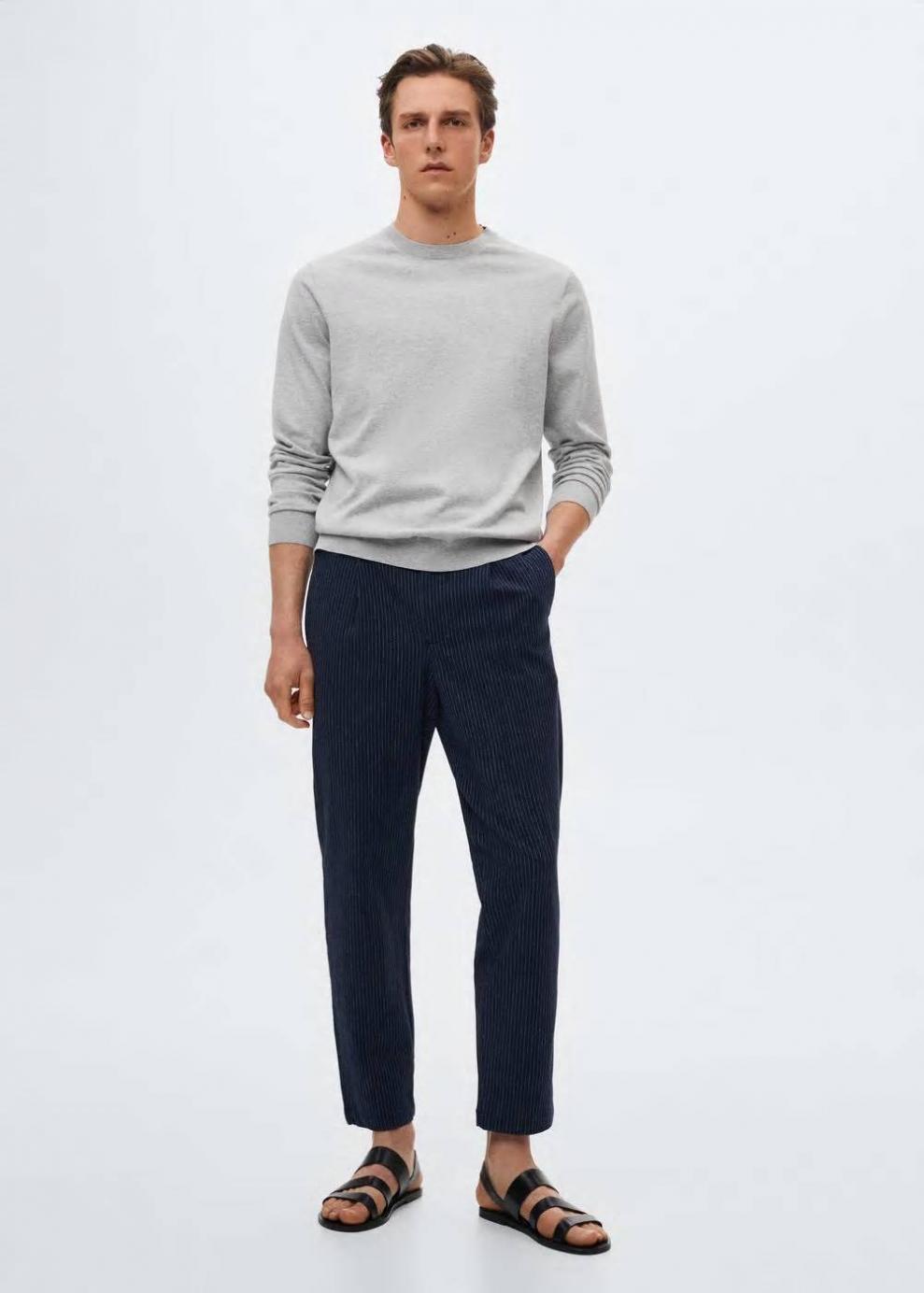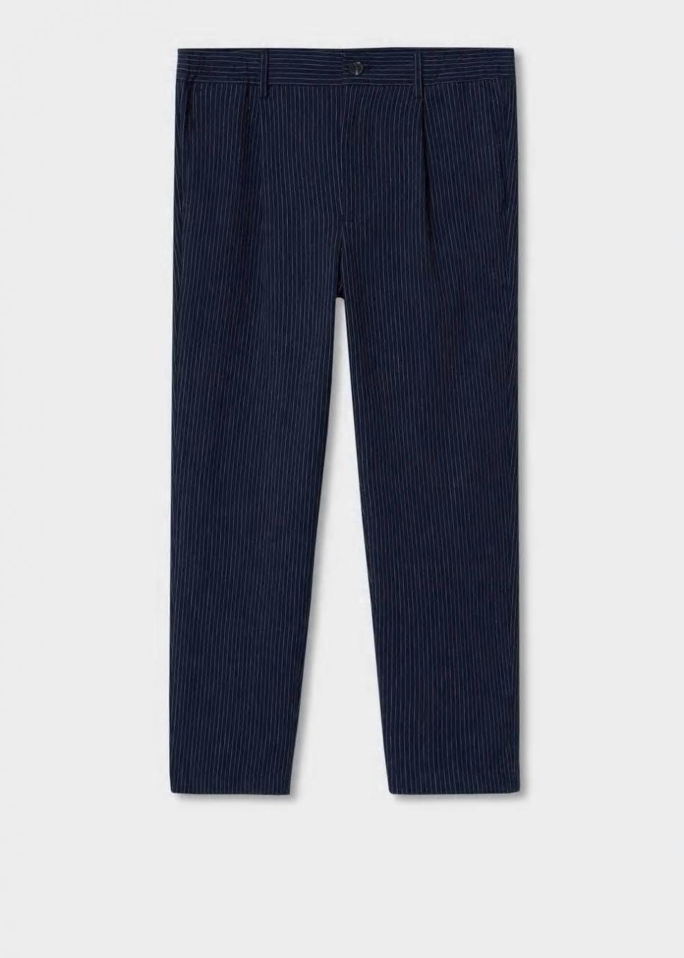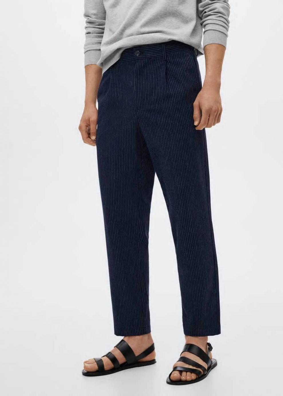 Regular fit Diseño de rayas Diseño recto Tejido de algodón sostenible Efecto seersucker Trabillas Pinzas en la parte delantera Dos bolsillos laterales Dos bolsillos de ribete en la parte posterior El modelo mide 187 cm y lleva una talla 42 Las prendas etiquetadas como Committed son productos que han sido confeccionadas con fibras y/o procesos de producción sostenible, reduciendo así su impacto ambiental. El objetivo de Mango es respaldar la implementación de prácticas más comprometidas con el medio ambiente, aumentando así, el número de prendas sostenibles en su colección.