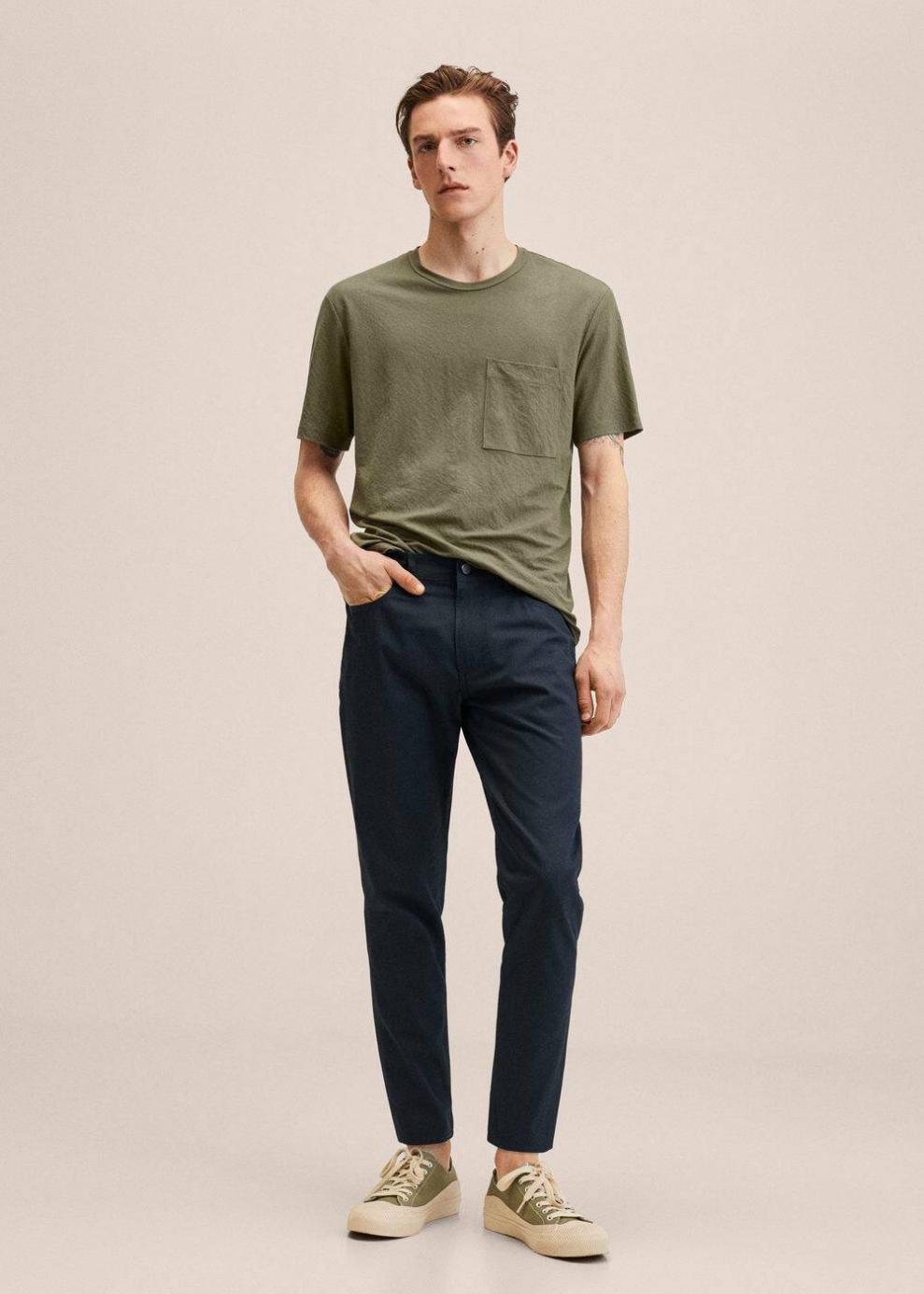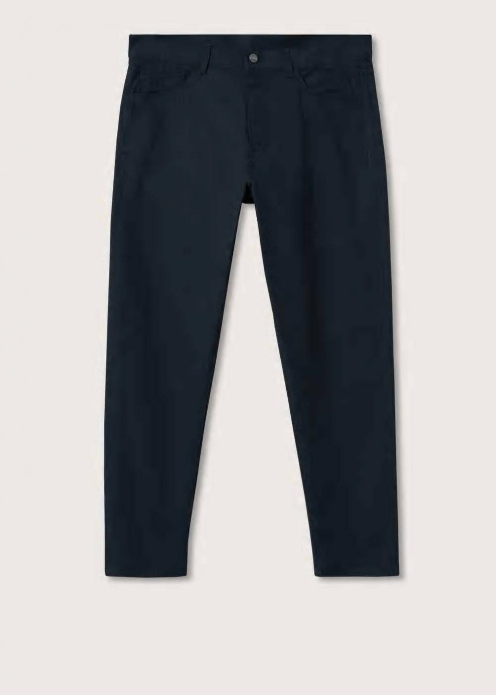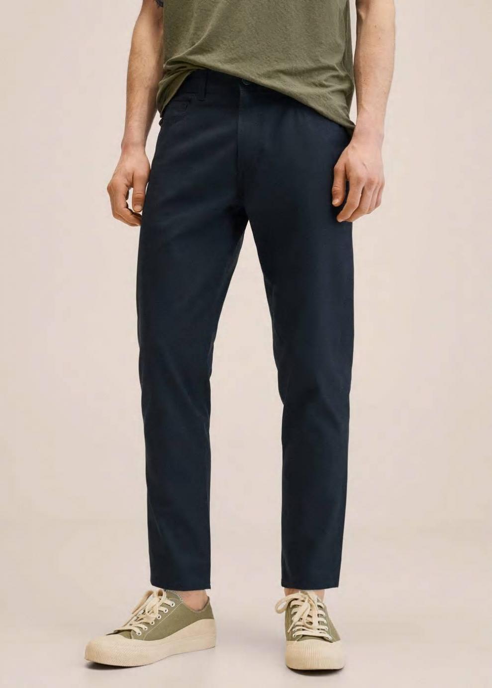 Tapered fit: corte ancho en la parte superior que se va estrechando de la rodilla al tobillo Tejido de algodón Trabillas Dos bolsillos laterales Bolsillo portamonedas Dos bolsillos de parche en la parte posterior Cierre de cremallera y botón El modelo mide 187 cm y lleva una talla 42 Las prendas etiquetadas como Committed son productos que han sido confeccionadas con fibras y/o procesos de producción sostenible, reduciendo así su impacto ambiental. El objetivo de Mango es respaldar la implementación de prácticas más comprometidas con el medio ambiente, aumentando así, el número de prendas sostenibles en su colección.