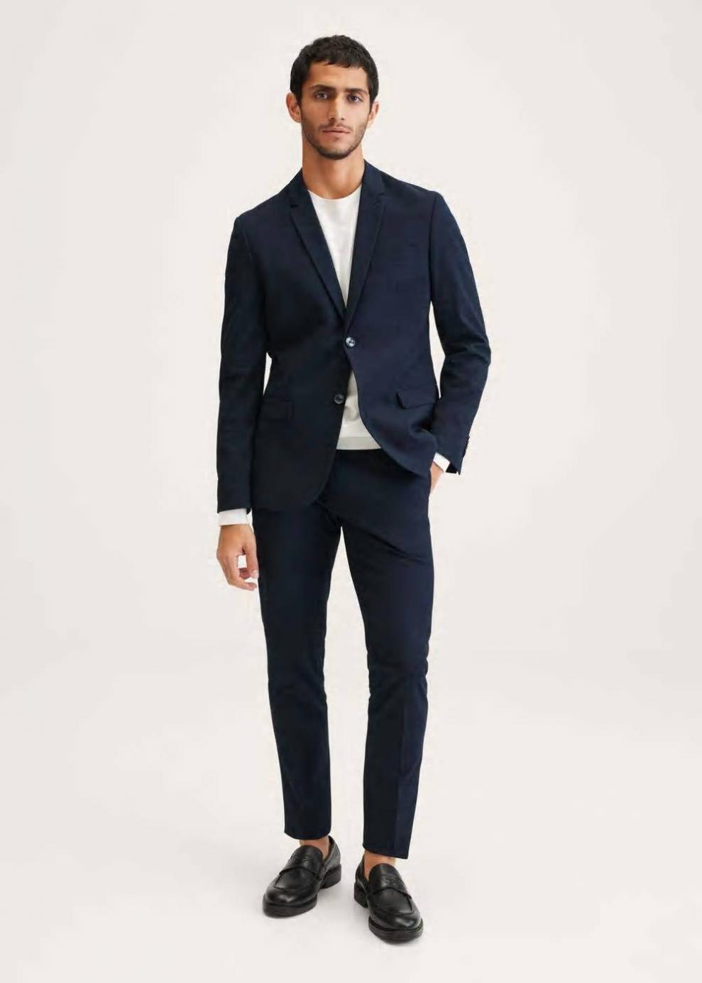 Super slim fit Tejido mezcla de poliéster reciclado Diseño cuadrado Trabillas Dos bolsillos laterales Bolsillo cerillero Dos bolsillos de ribete en la parte posterior Cierre oculto de botón, gancho y cremallera El modelo mide 183 cm y lleva una talla 40 El modelo Super Slim es el fit más ajustado que encontrarás en nuestra colección de trajes. Se ha diseñado en diferentes colores y estampados para vestir distintos momentos del día y ajustarse a tu personalidad. Ideal para eventos y celebraciones informales. Combínalo con una corbata y camisa si quieres darle un aire más clásico y formal.