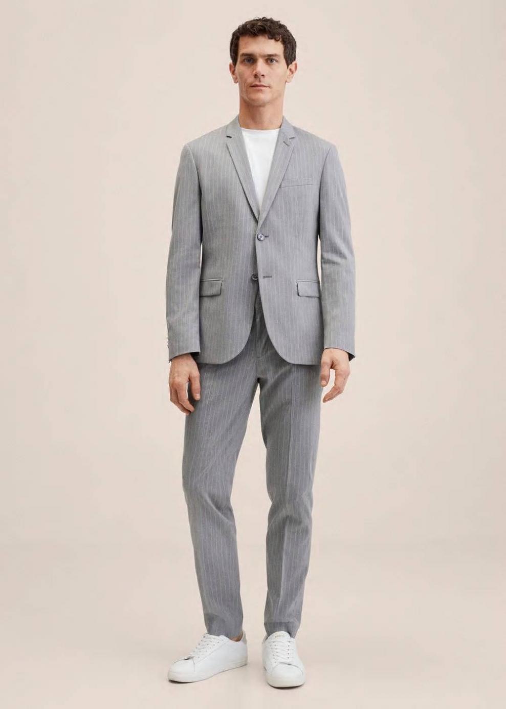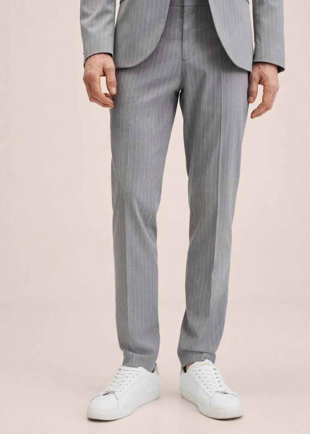 Exclusivo Online Super slim fit Diseño de rayas Tejido mezcla de poliéster reciclado Trabillas Dos bolsillos laterales Bolsillo cerillero Dos bolsillos de ribete en la parte posterior Cierre oculto de botón, gancho y cremallera El modelo mide 185 cm y lleva una talla 40 El modelo Super Slim es el fit más ajustado que encontrarás en nuestra colección de trajes. Se ha diseñado en diferentes colores y estampados para vestir distintos momentos del día y ajustarse a tu personalidad. Ideal para eventos y celebraciones informales. Combínalo con una corbata y camisa si quieres darle un aire más clásico y formal.