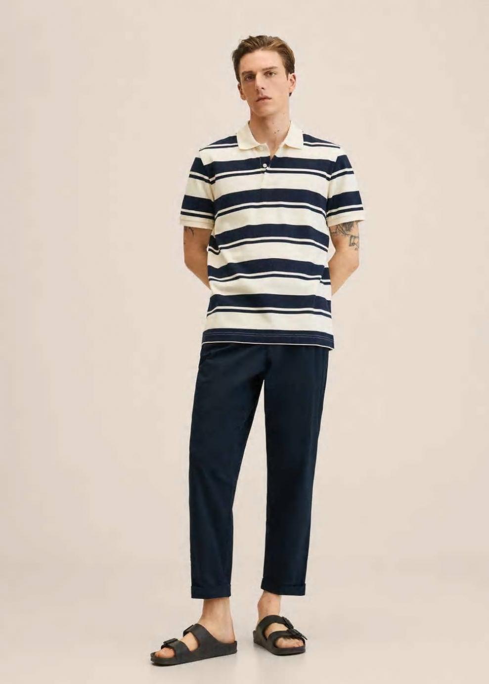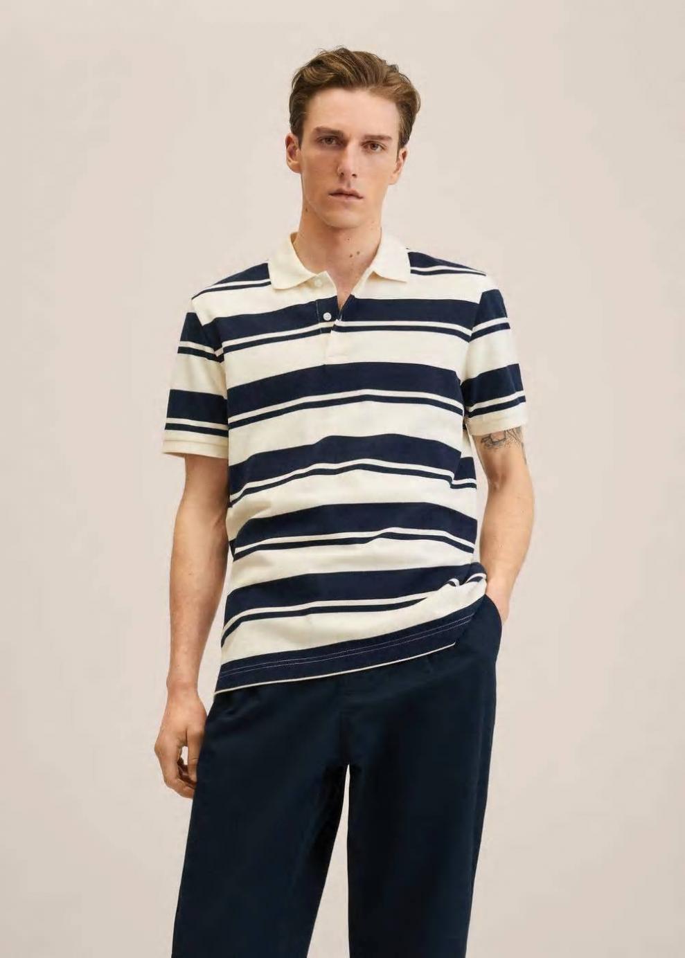 Diseño de rayas Regular fit Tejido de algodón sostenible Tejido de piqué Cuello polo Manga corta Cierre de botones El modelo mide 187 cm y lleva una talla M Las prendas etiquetadas como Committed son productos que han sido confeccionadas con fibras y/o procesos de producción sostenible, reduciendo así su impacto ambiental. El objetivo de Mango es respaldar la implementación de prácticas más comprometidas con el medio ambiente, aumentando así, el número de prendas sostenibles en su colección.