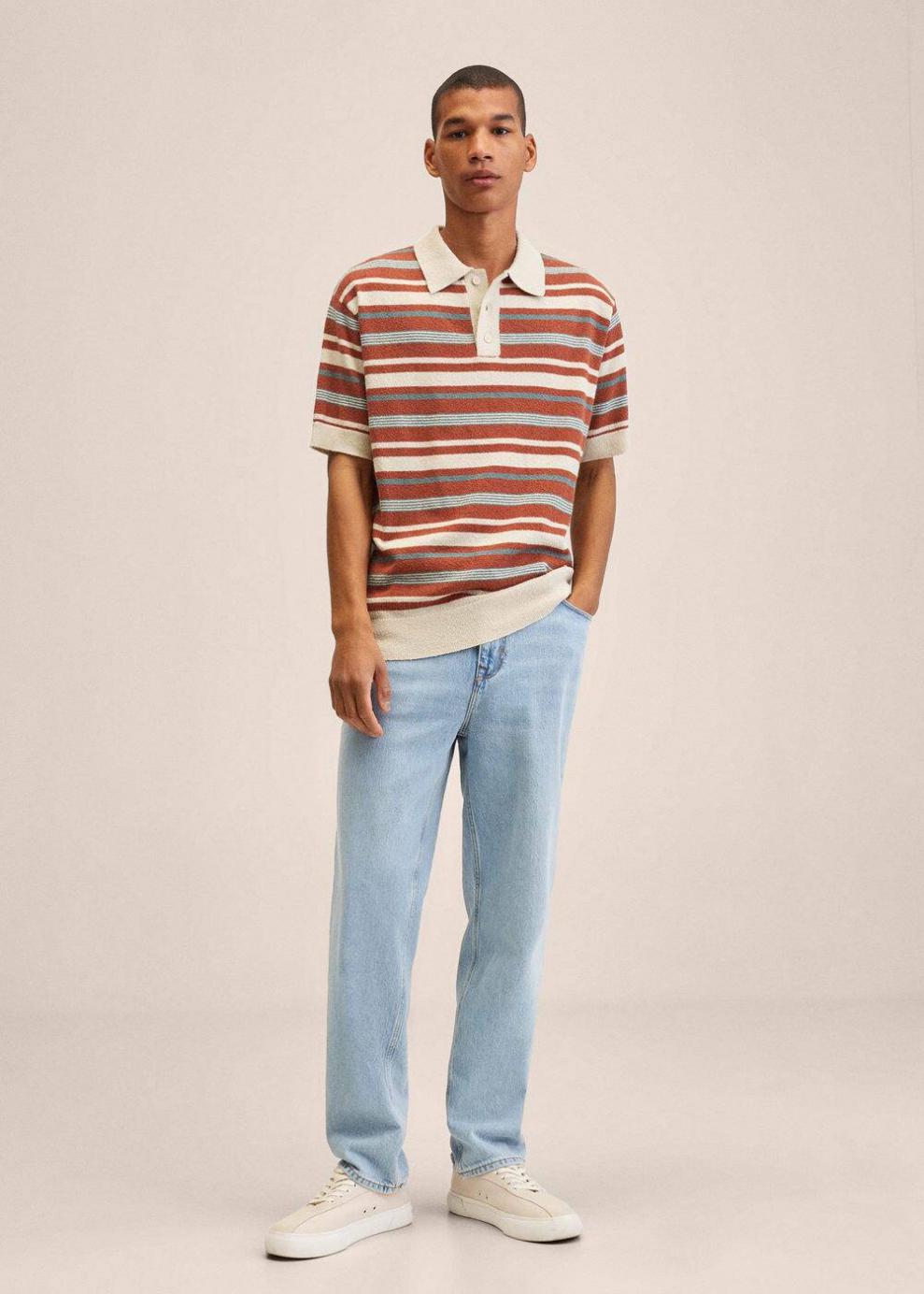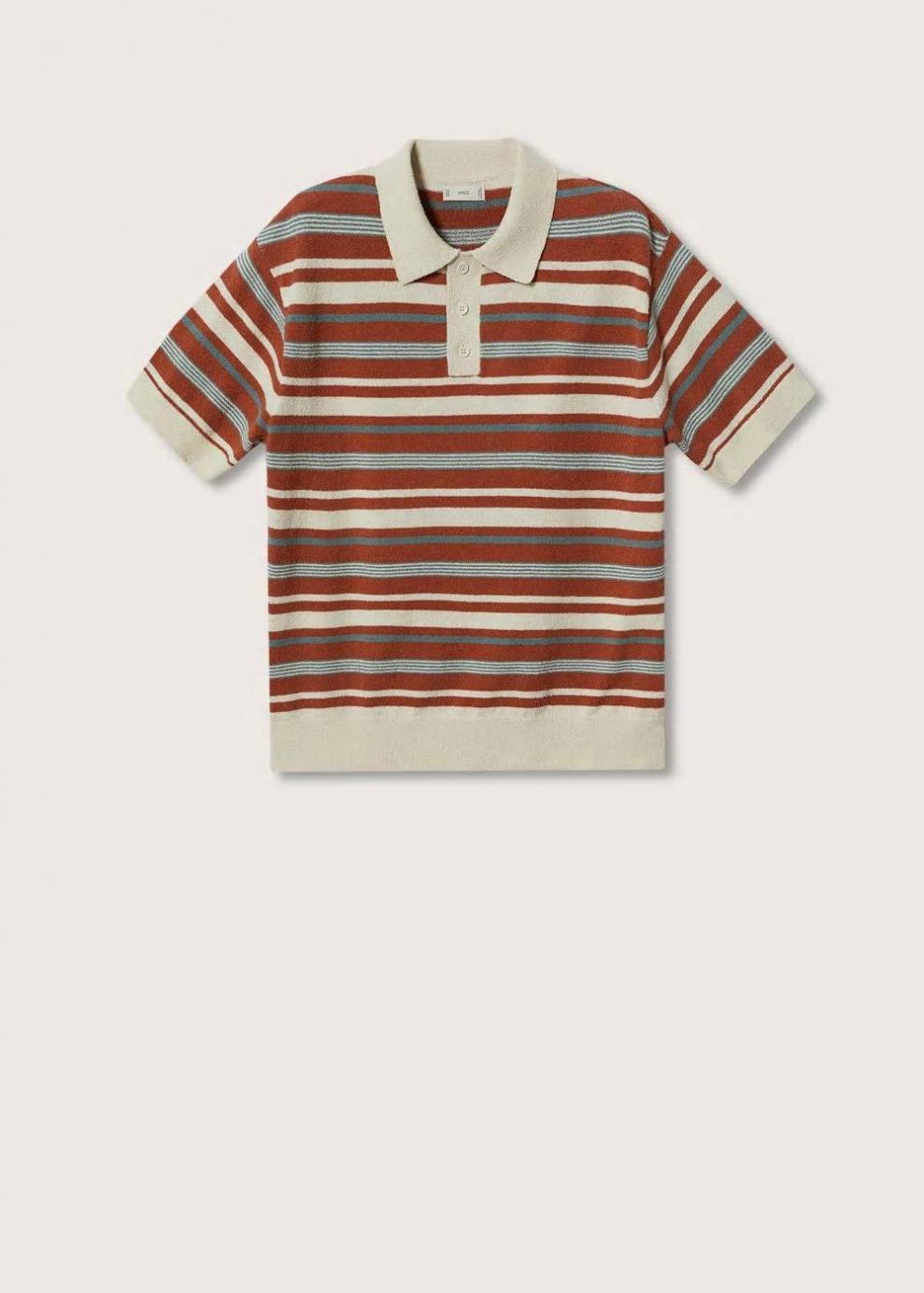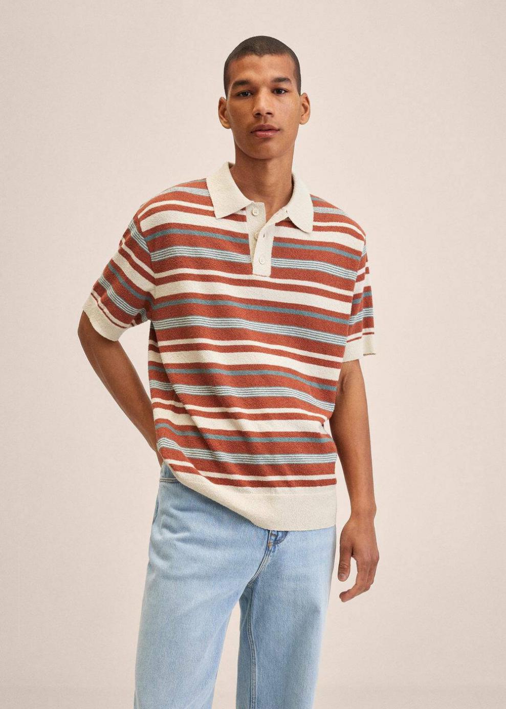 Diseño de rayas Tejido mezcla de algodón sostenible Tejido con textura Cuello polo Manga corta Cierre de botones El modelo mide 183 cm y lleva una talla M