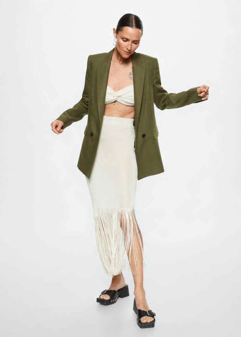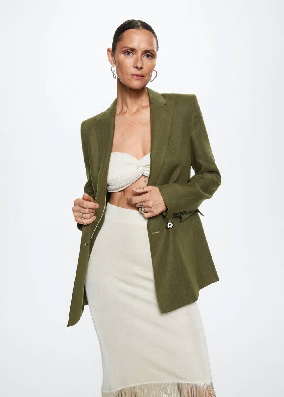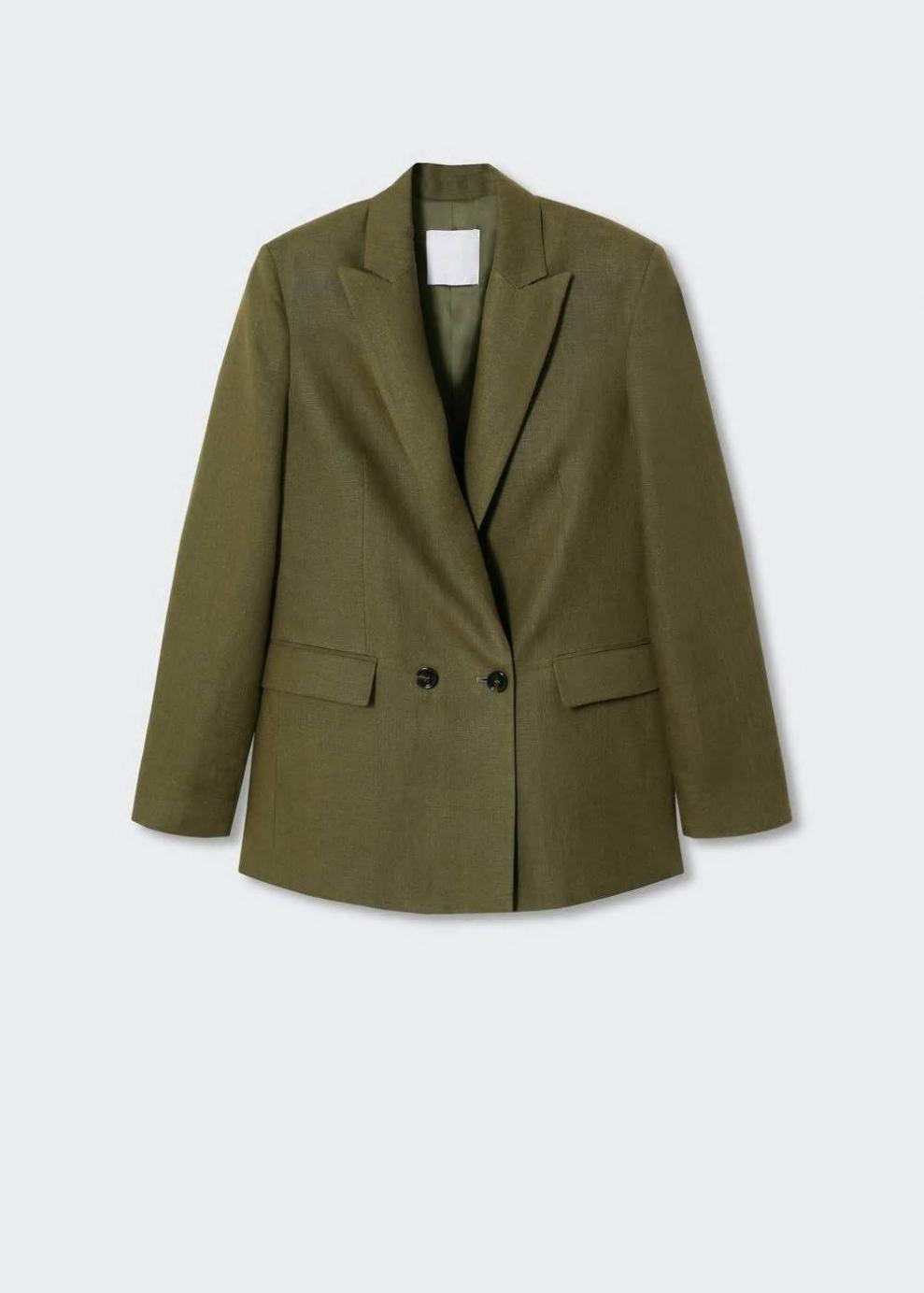 Colección Committed 100% Lino Estilo traje Diseño recto Cuello pico con solapa Manga larga con puños abotonados Diseño doble botonadura Hombreras Bolsillos de solapa Forro interior Total look Las prendas etiquetadas como Committed son productos que han sido confeccionadas con fibras y/o procesos de producción sostenible, reduciendo así su impacto ambiental. El objetivo de Mango es respaldar la implementación de prácticas más comprometidas con el medio ambiente, aumentando así, el número de prendas sostenibles en su colección.