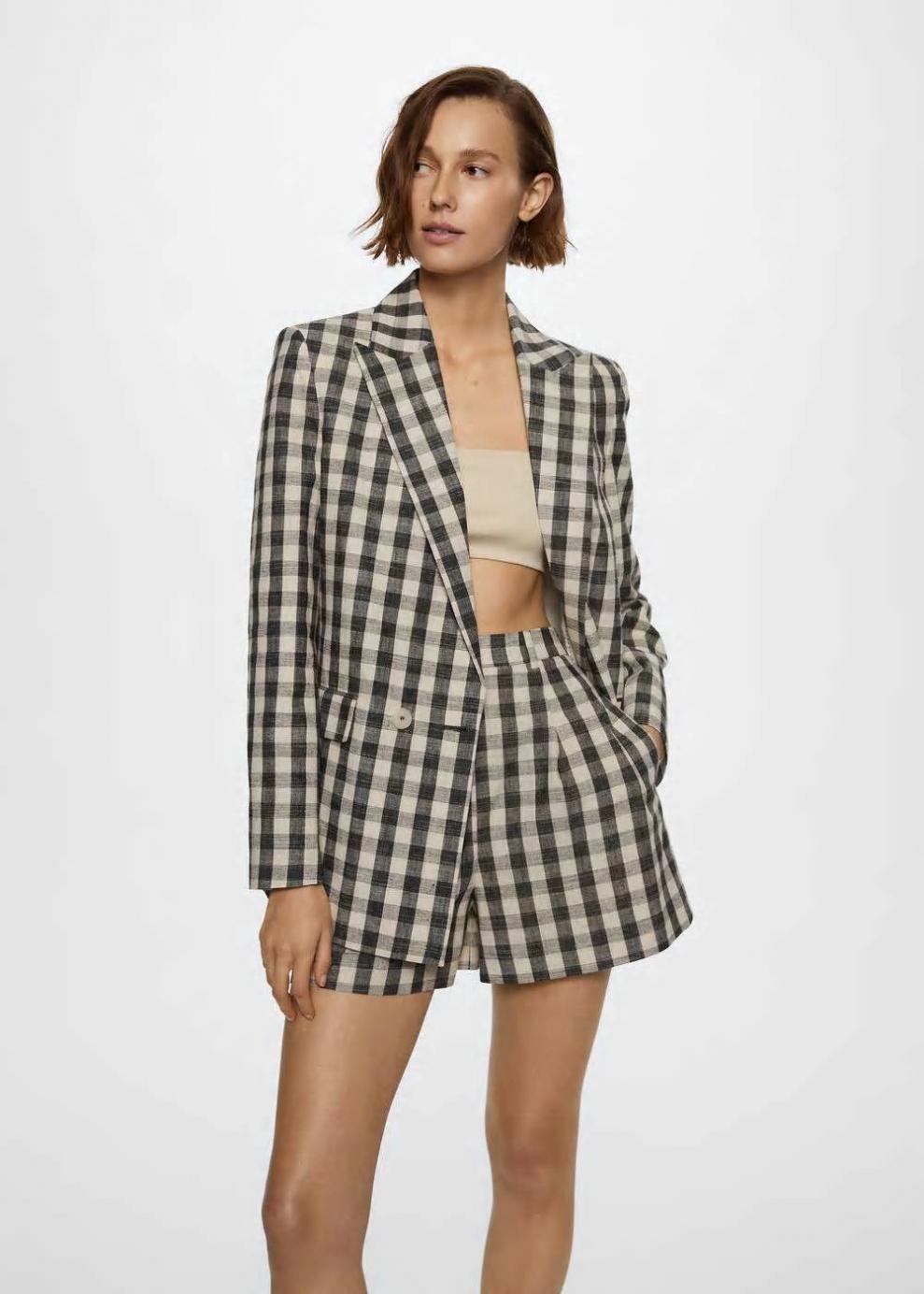 Colección Committed Tejido mezcla de algodón y lino Estampado de cuadros Diseño largo Diseño recto Estilo traje Cuello pico con solapa Manga larga Bolsillos de solapa Forro interior Cierre de doble botonadura Total look Las prendas etiquetadas como Committed son productos que han sido confeccionadas con fibras y/o procesos de producción sostenible, reduciendo así su impacto ambiental. El objetivo de Mango es respaldar la implementación de prácticas más comprometidas con el medio ambiente, aumentando así, el número de prendas sostenibles en su colección.