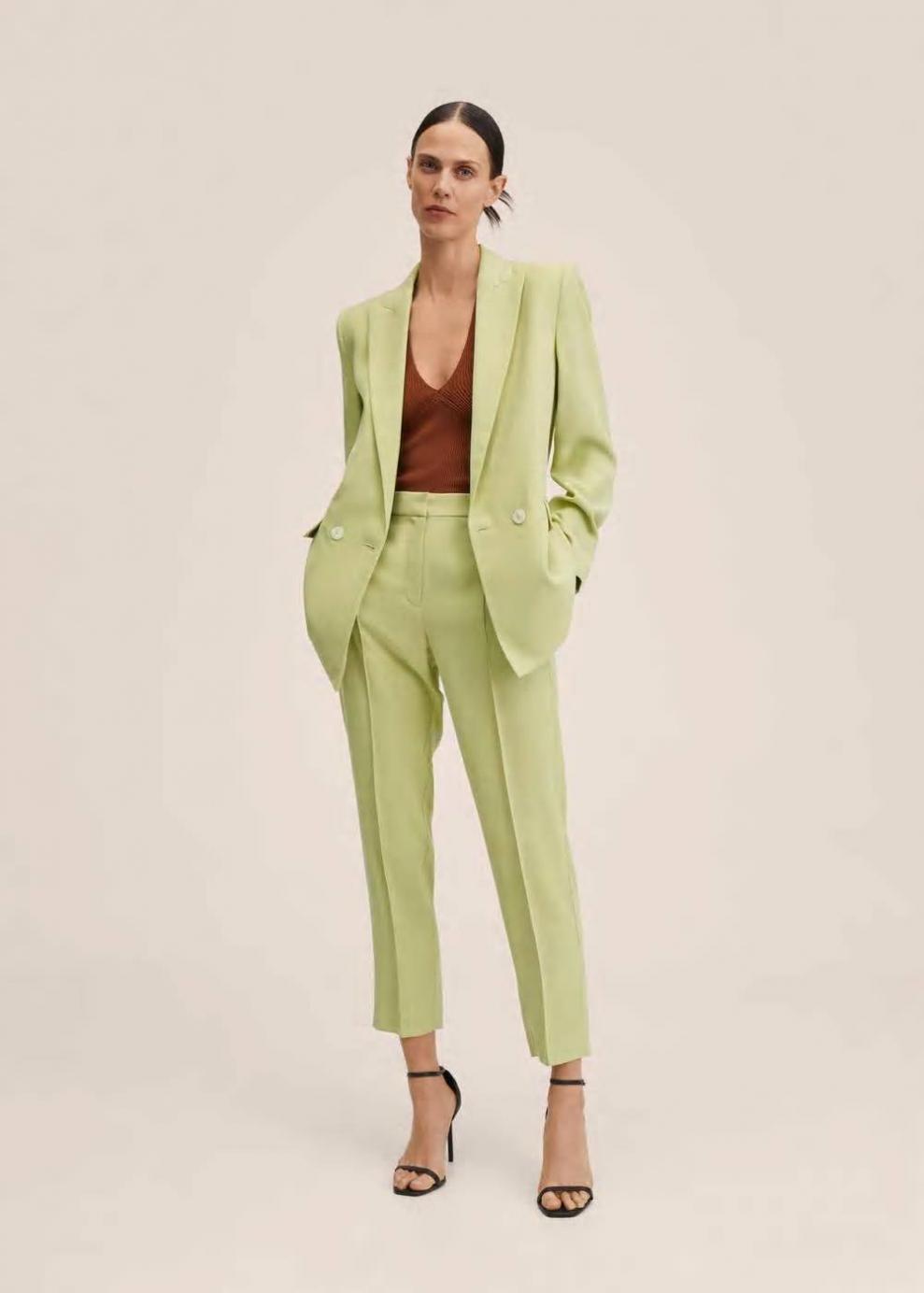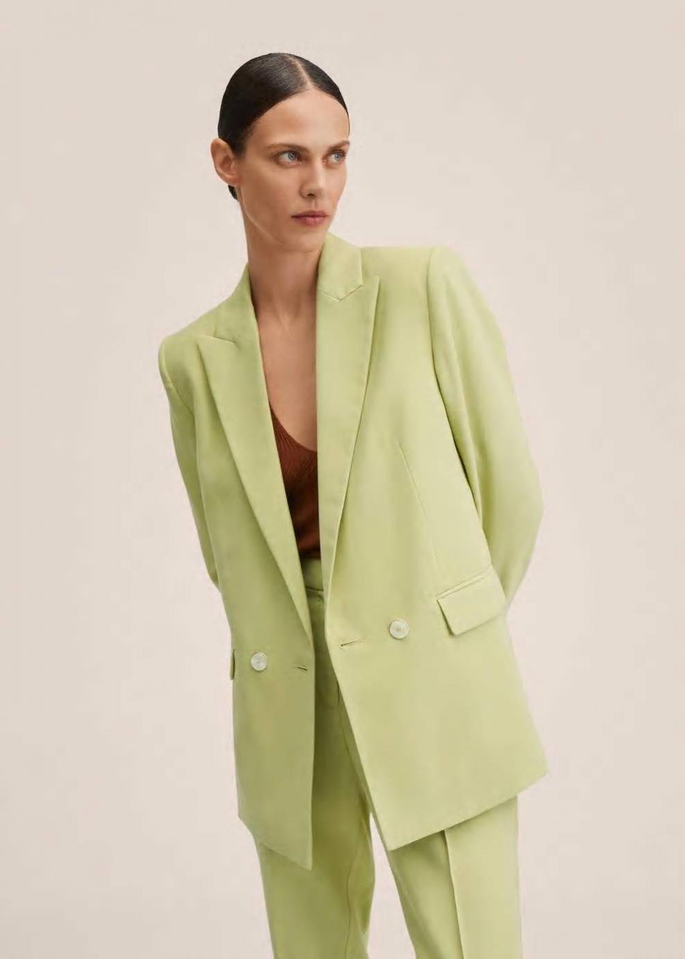 Diseño recto Diseño largo Diseño estructurado Cuello pico con solapa Solapas con muesca Manga larga con puños abotonados Hombreras Dos bolsillos de solapa Bolsillo de ribete Abertura posterior en el bajo Forro interior Cierre de doble botonadura Total look