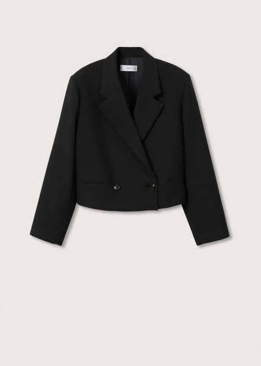 Colección Committed Diseño recto Diseño crop Cuello cruzado Solapas Manga larga Forro interior Cierre de doble botonadura Total look Las prendas etiquetadas como Committed son productos que han sido confeccionadas con fibras y/o procesos de producción sostenible, reduciendo así su impacto ambiental. El objetivo de Mango es respaldar la implementación de prácticas más comprometidas con el medio ambiente, aumentando así, el número de prendas sostenibles en su colección.