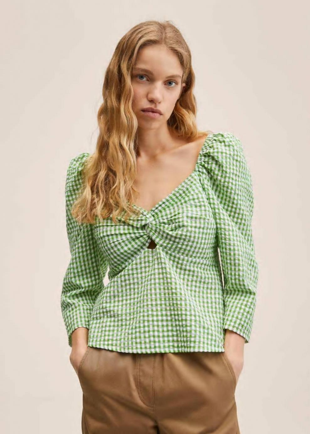 Tejido mezcla de algodón Estampado de cuadros de vichy Diseño crop Diseño recto Cuello escotado Manga tres cuartos abullonada Detalles elásticos en las mangas Nudo decorativo Abertura en la parte delantera Fruncido elástico