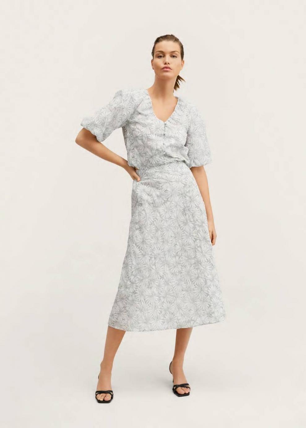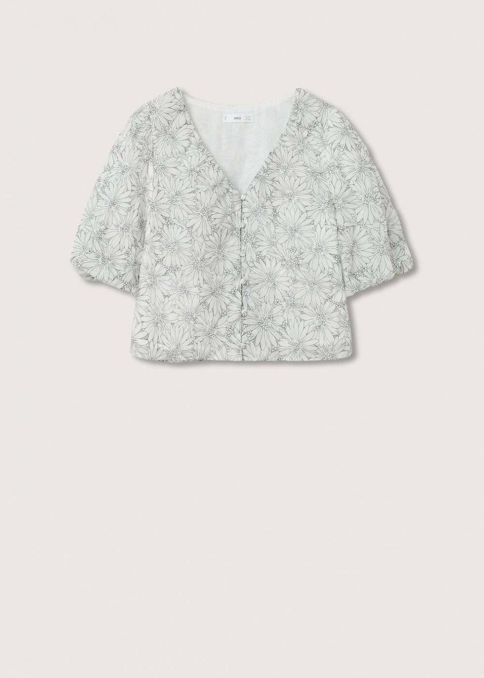Cierre delantero Cuello pico Tejido ligero 100% Algodón Diseño estándar Estampado floral Diseño recto Cuello de pico Manga corta Cierre de botones Forro interior de algodón Total look Las prendas etiquetadas como Committed son productos que han sido confeccionadas con fibras y/o procesos de producción sostenible, reduciendo así su impacto ambiental. El objetivo de Mango es respaldar la implementación de prácticas más comprometidas con el medio ambiente, aumentando así, el número de prendas sostenibles en su colección.