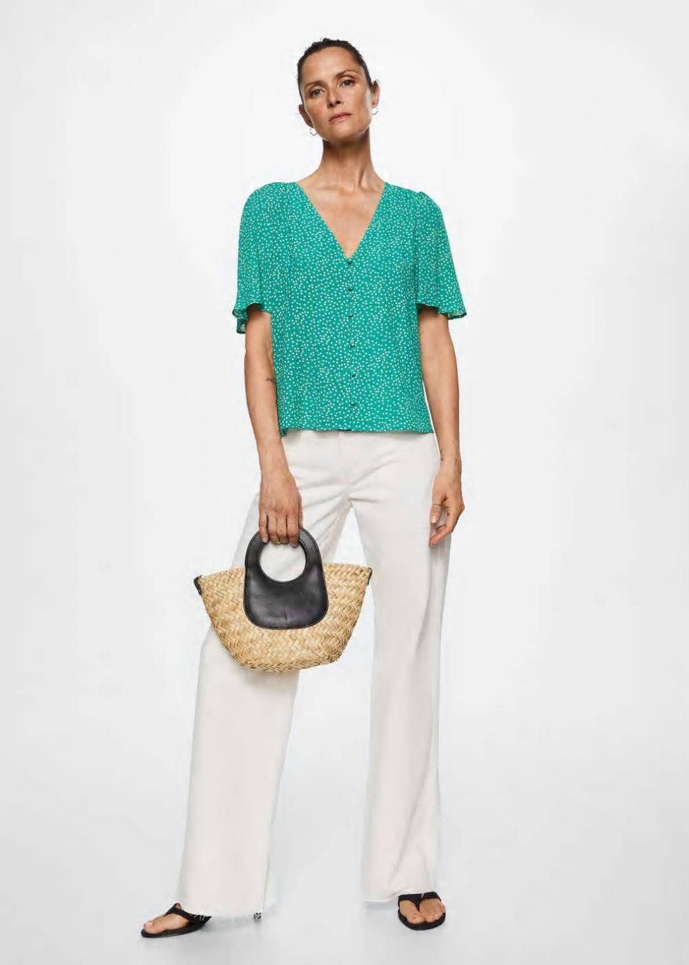 Colección Committed Tejido fluido Diseño recto Estampado de lunares Estampado floral Escote de pico Manga corta Cierre de botones en la parte delantera Disponible Plus Las prendas etiquetadas como Committed son productos que han sido confeccionadas con fibras y/o procesos de producción sostenible, reduciendo así su impacto ambiental. El objetivo de Mango es respaldar la implementación de prácticas más comprometidas con el medio ambiente, aumentando así, el número de prendas sostenibles en su colección.