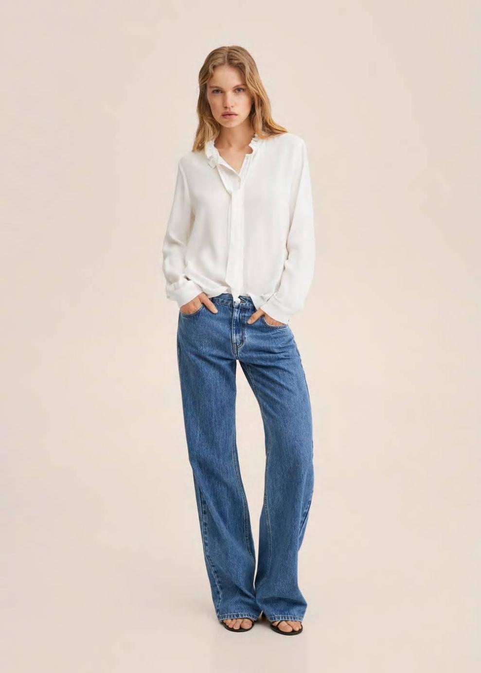 Tejido fluido Diseño oversize Diseño largo Cuello mao Detalle de volantes en el cuello Cierre de lazo en el cuello Manga larga con puños abotonados Cierre de botones en la parte delantera