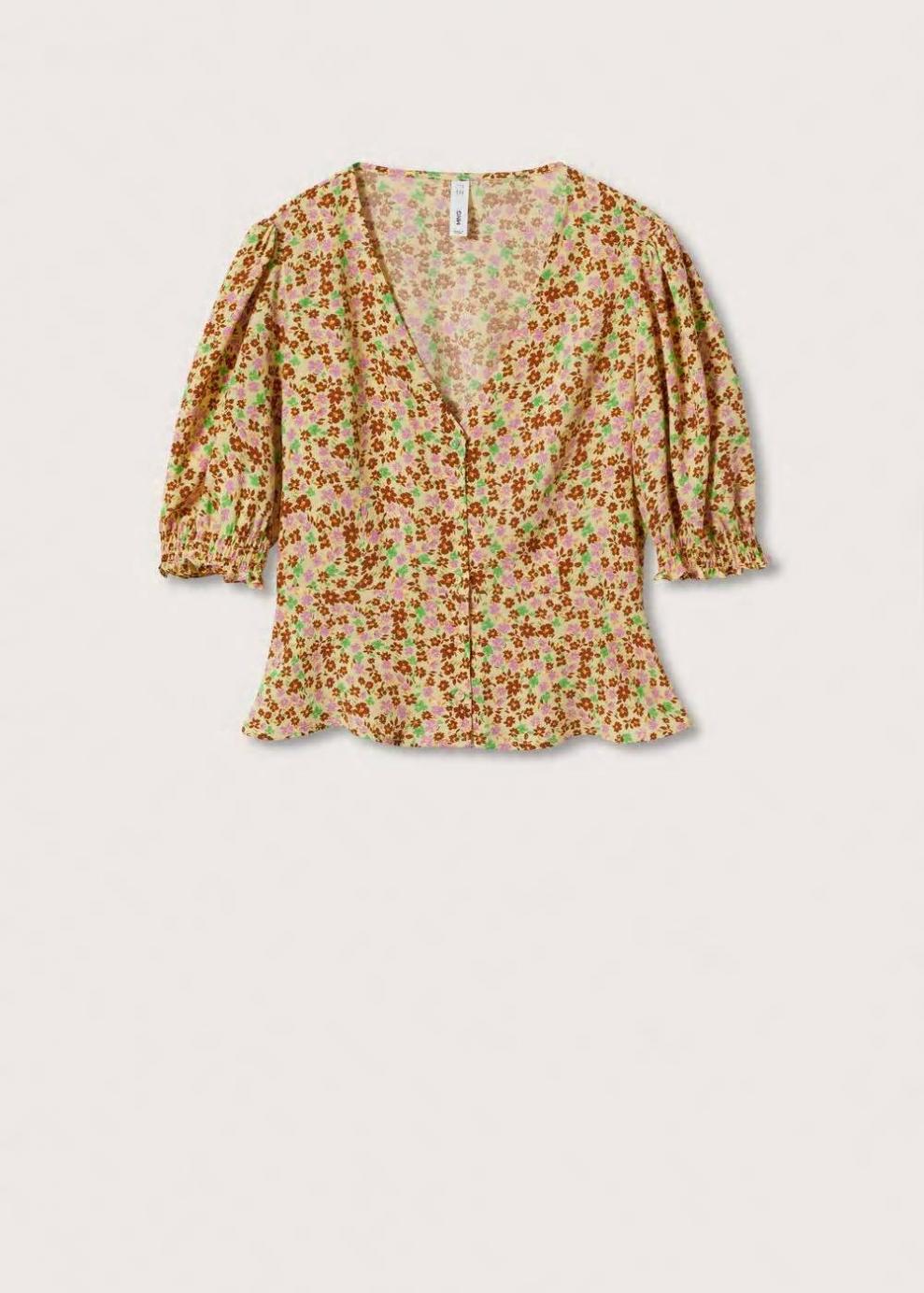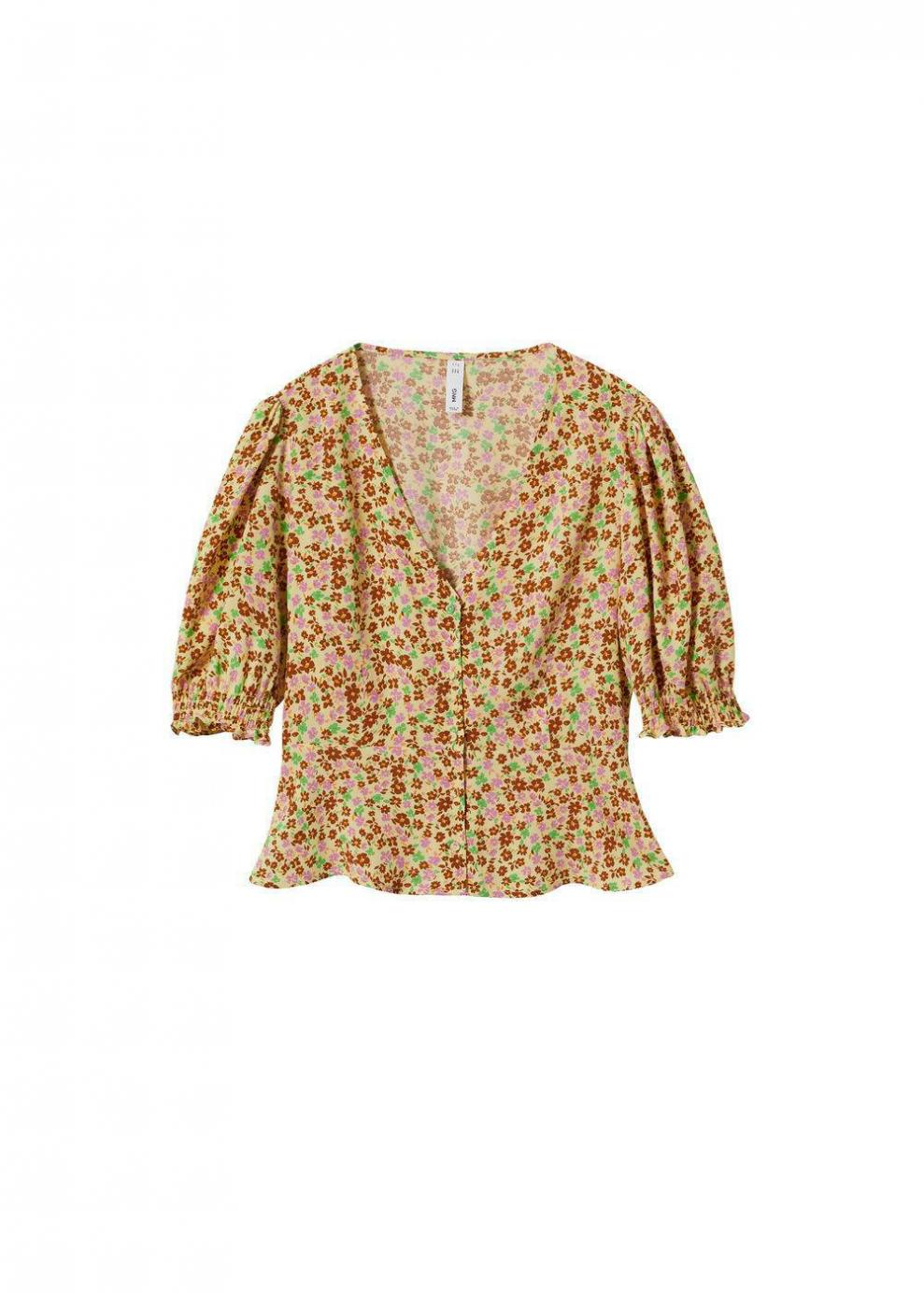 Tejido fluido Diseño estampado Diseño corto Cuello pico Manga corta abullonada Detalles elásticos en las mangas Cierre de botones en la parte delantera Total look