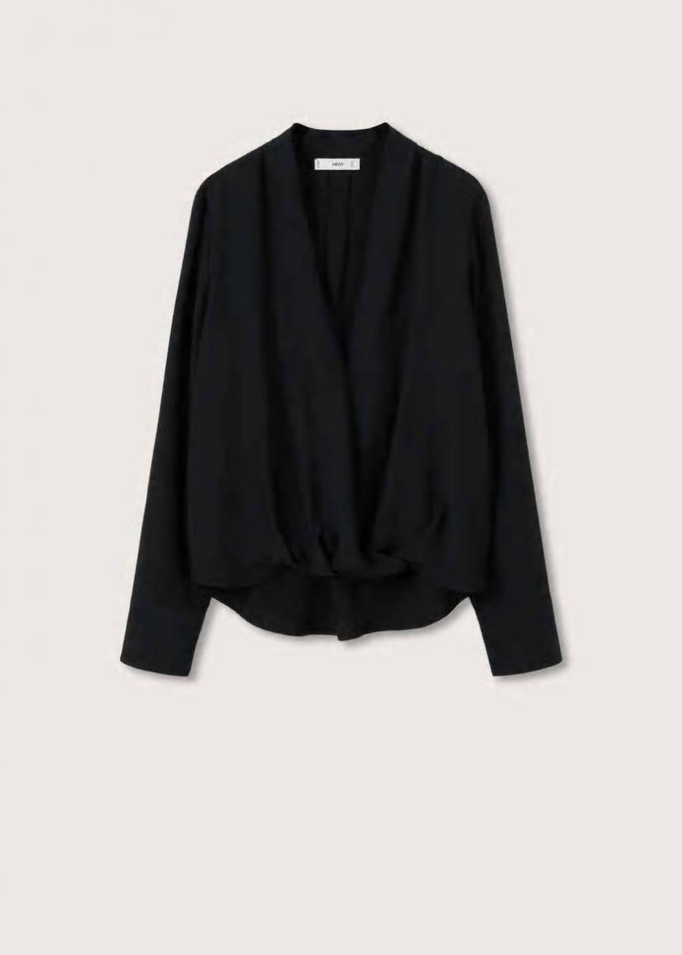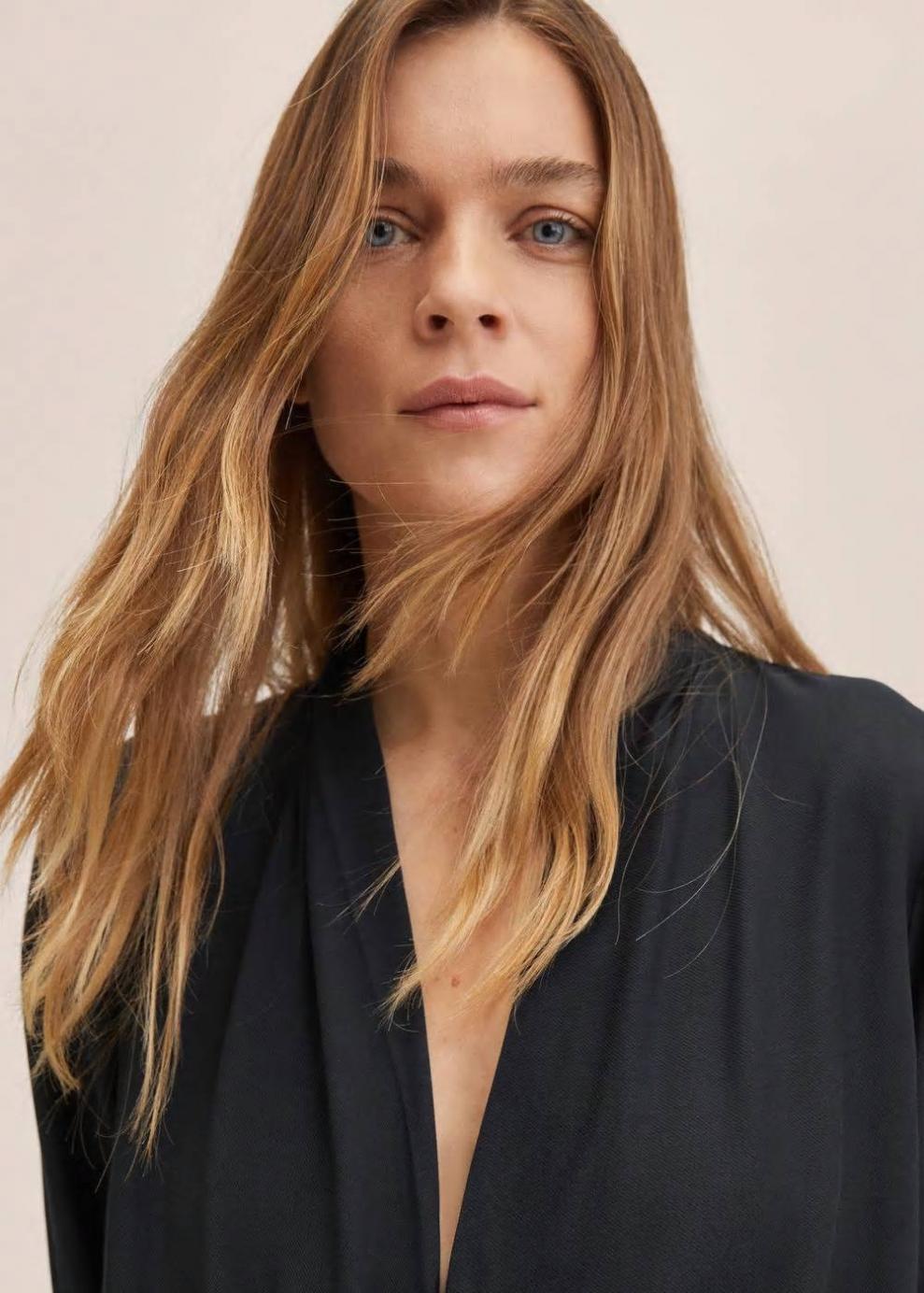 Tejido mezcla de modal Diseño estándar Diseño recto Diseño oversize Diseño cruzado Cuello de pico Manga larga con puños abotonados Detalle drapeado Detalle de pinzas Cierre de botón a presión Colección fiesta y ceremonia