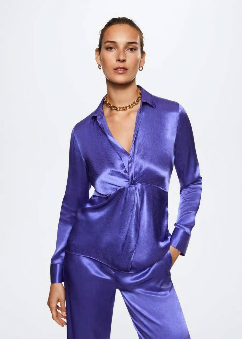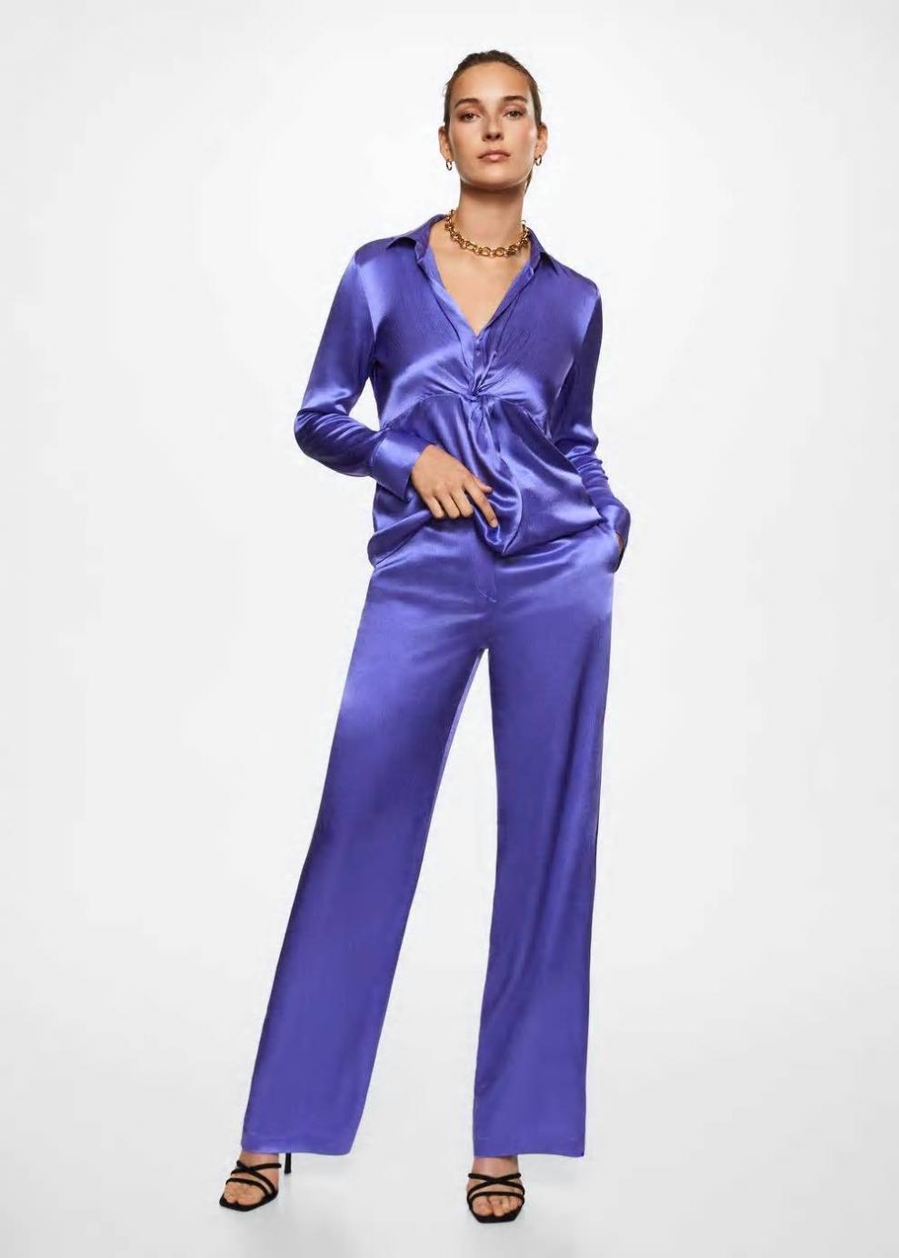 Tejido fluido Tejido satinado Diseño recto Cuello camisero Diseño recto Cuello escotado Detalle de abertura Manga larga Colección fiesta y ceremonia Total look