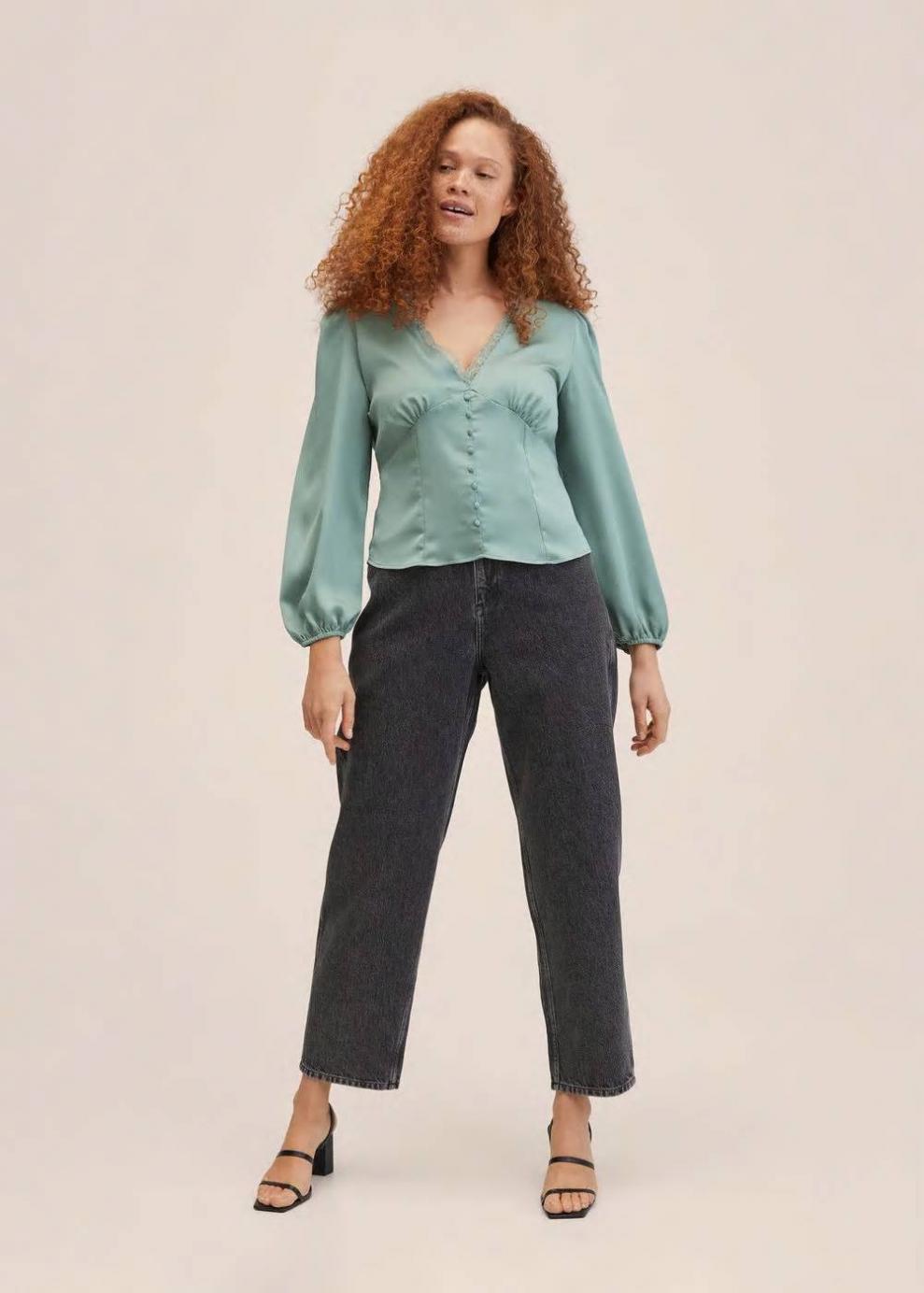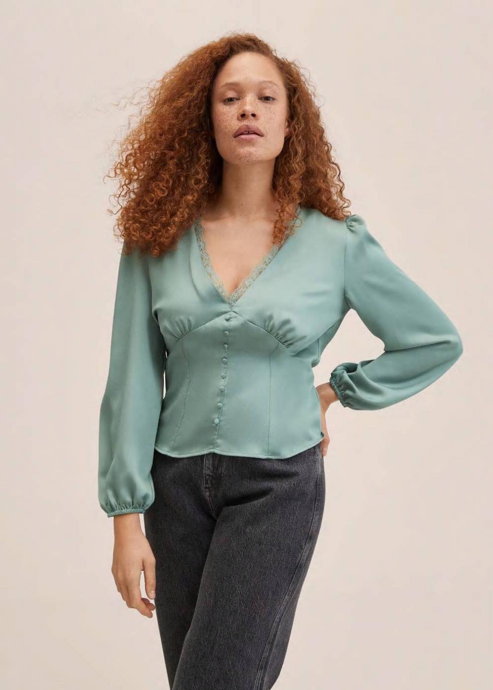 Colección Committed Tejido satinado Detalle encaje Diseño recto Cuello pico Manga larga con puños elásticos Detalle de botones decorativos Detalle de pinzas Las prendas etiquetadas como Committed son productos que han sido confeccionadas con fibras y/o procesos de producción sostenible, reduciendo así su impacto ambiental. El objetivo de Mango es respaldar la implementación de prácticas más comprometidas con el medio ambiente, aumentando así, el número de prendas sostenibles en su colección.