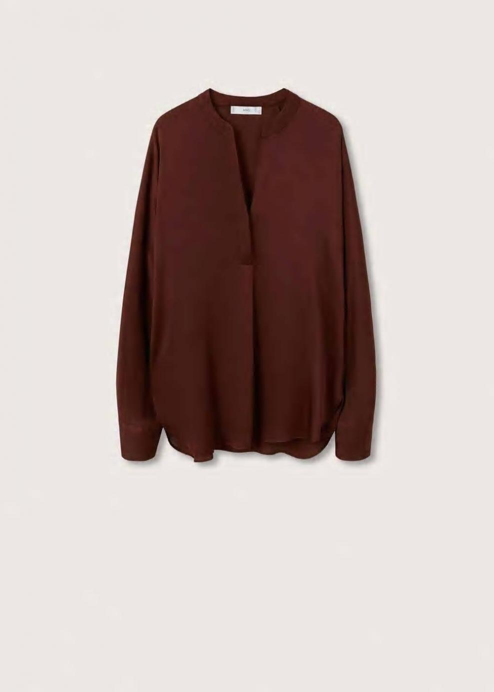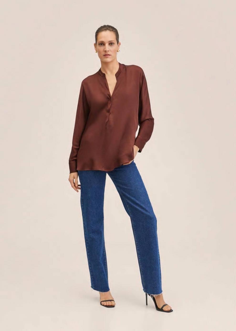 Manga larga Tejido satinado Tejido ligero Cierre delantero Diseño recto Cuello mao Cuello de pico co…