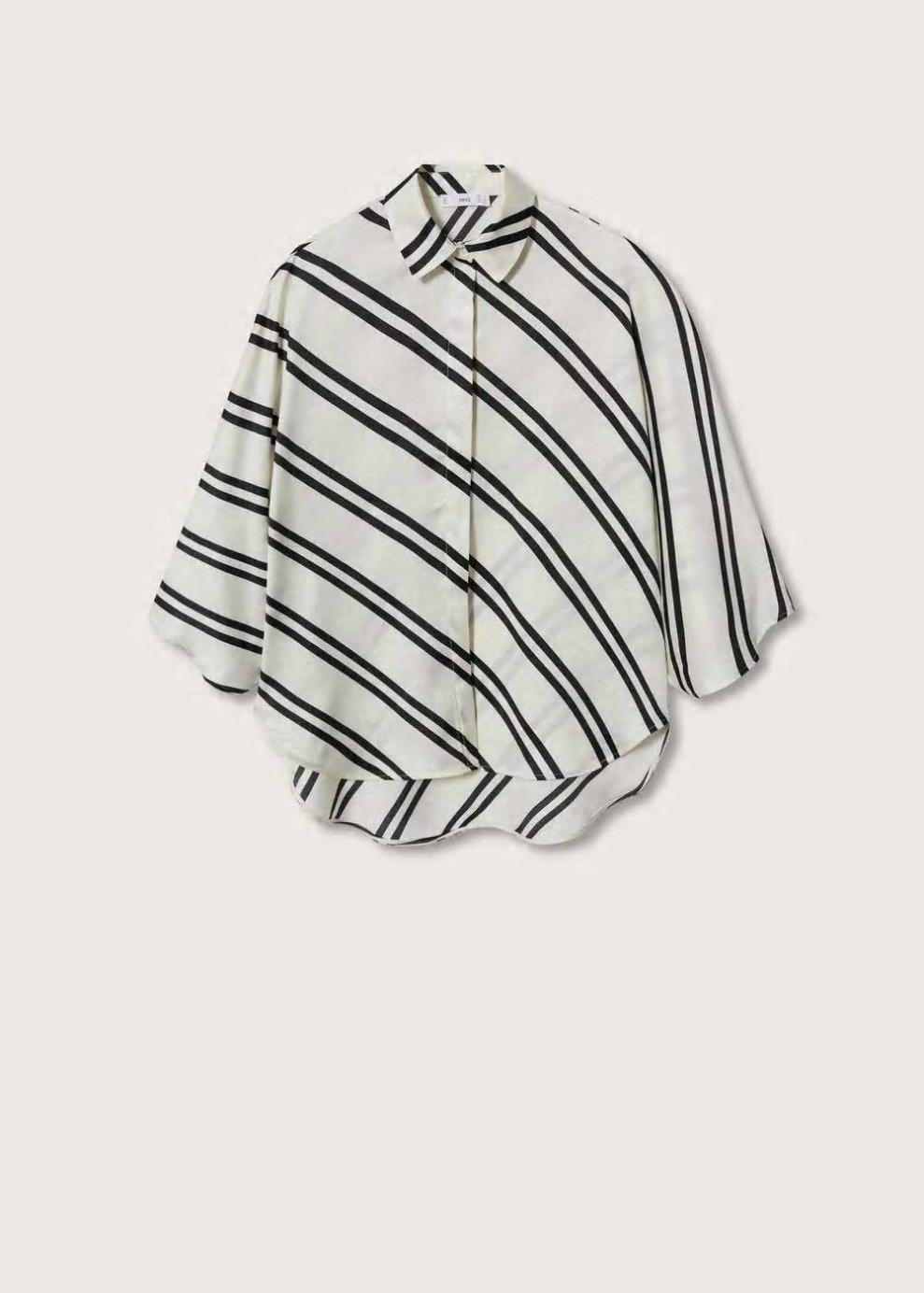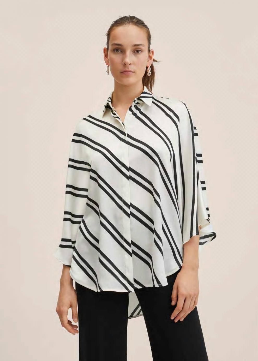 Tejido satinado Estampado de rayas Diseño oversize Diseño largo Cuello camisero Manga tres cuartos murciélago Cierre de botones oculto en la part…