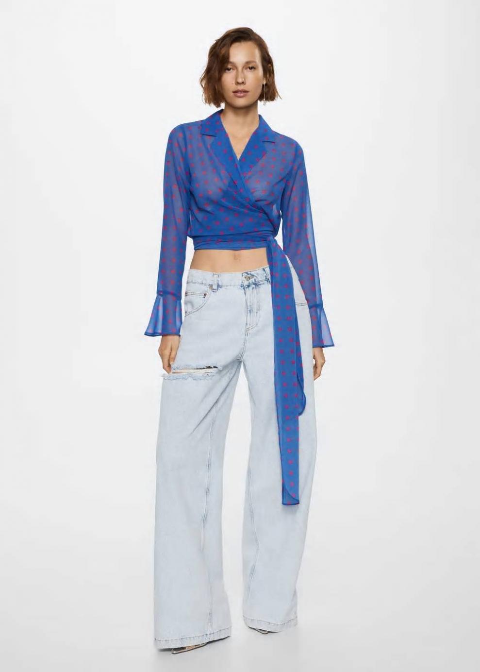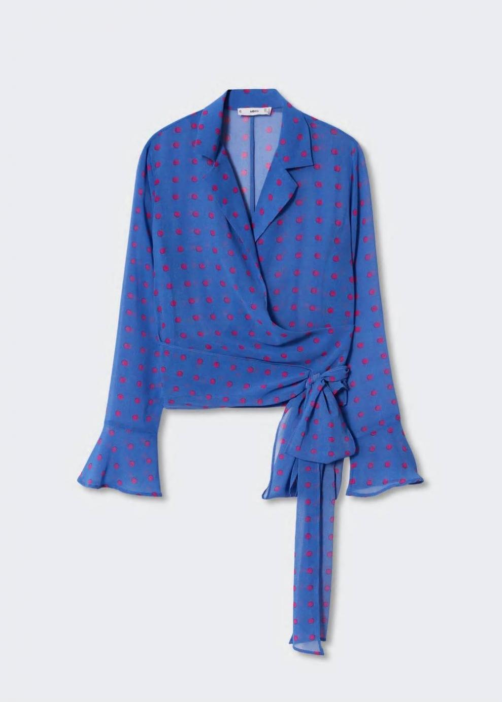 Colección Committed Tejido semitransparente Estampado de lunares Diseño recto Diseño crop Diseño cruzado Cuello camisero Manga larga con volante Cierre de lazo lateral Colección fiesta y ceremonia Las prendas etiquetadas como Committed son productos que han sido confeccionadas con fibras y/o procesos de producción sostenible, reduciendo así su impacto ambiental. El objetivo de Mango es respaldar la implementación de prácticas más comprometidas con el medio ambiente, aumentando así, el número de prendas sostenibles en su colección.