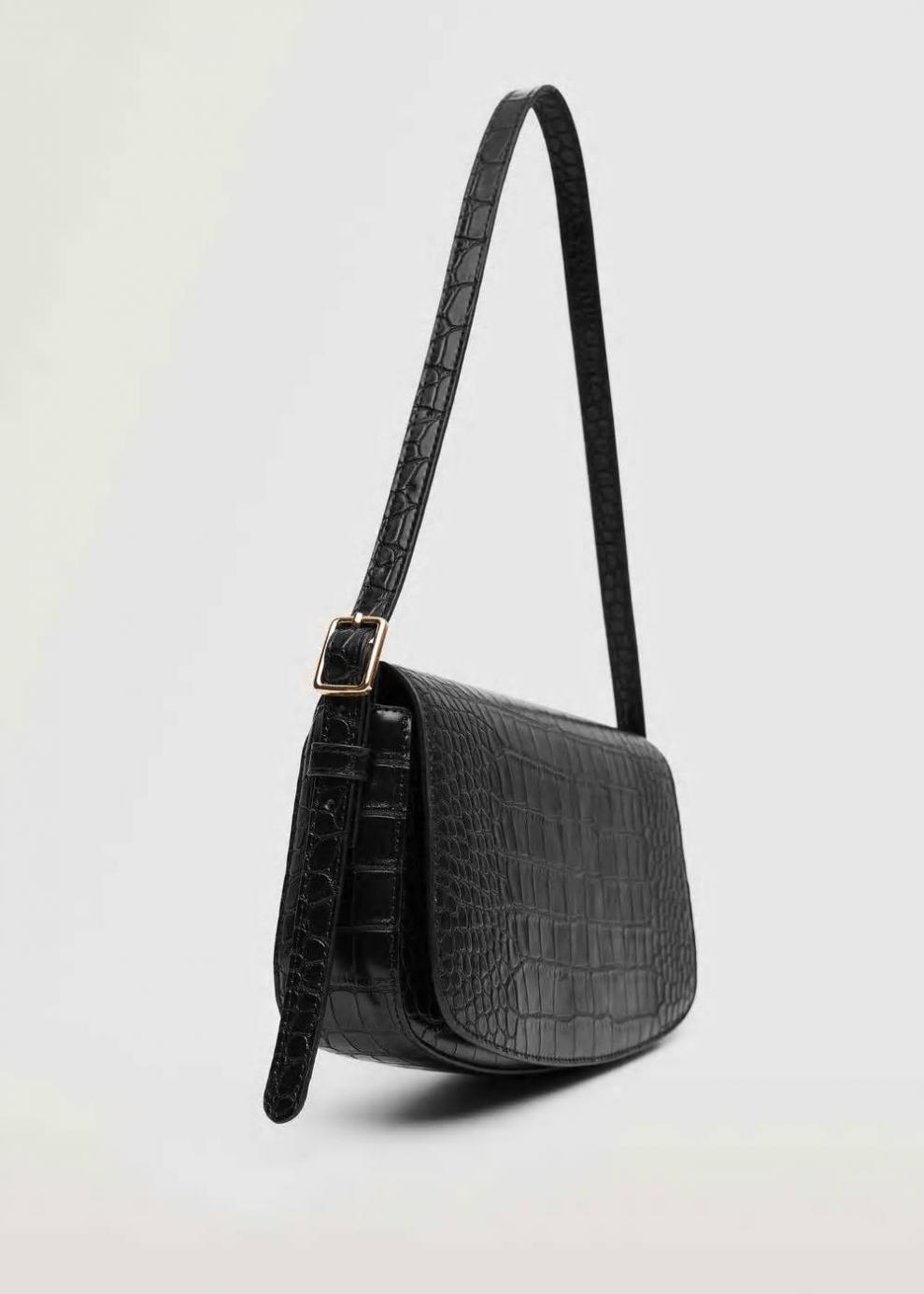 Efecto cocodrilo Tamaño mediano Solapa frontal Asa de hombro Asa ajustable Bolsillo interior Forro interior Cierre de botón…