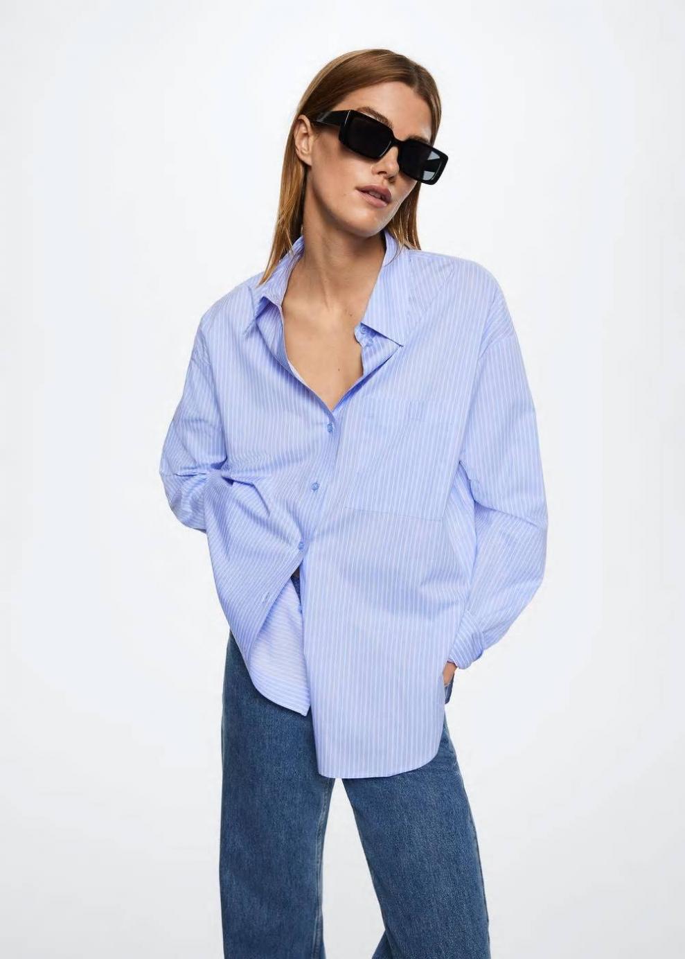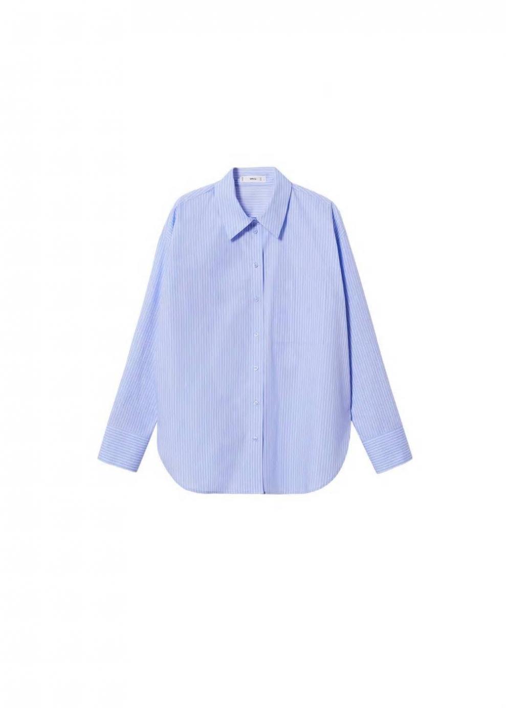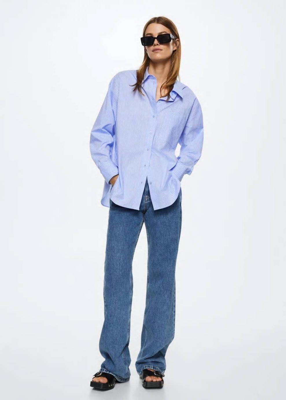 Colección Committed Tejido 100% algodón Tejido popelín de algodón Diseño oversize Diseño largo Estilo traje Cuello camisero Bolsillo en el pecho Manga larga con puños abotonados Cierre de botones en la parte delantera Disponible en liso o estampado Estampado de rayas Tallaje más grande de lo habitual Las prendas etiquetadas como Committed son productos que han sido confeccionadas con fibras y/o procesos de producción sostenible, reduciendo así su impacto ambiental. El objetivo de Mango es respaldar la implementación de prácticas más comprometidas con el medio ambiente, aumentando así, el número de prendas sostenibles en su colección.