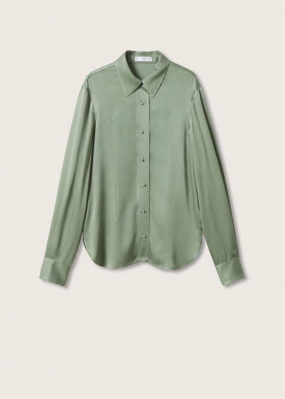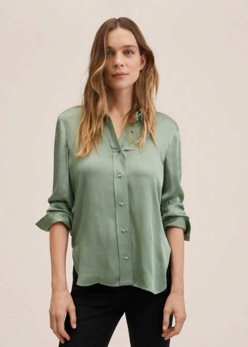 Tejido satinado Manga larga Cierre delantero Diseño estándar Diseño recto Tejido ligero Diseño oversize Cuello camisero Manga larga con puños abotonados Cierre de botones de perla…