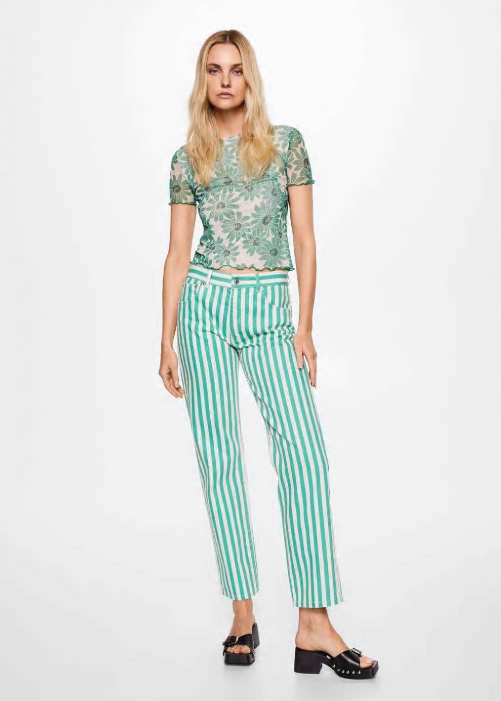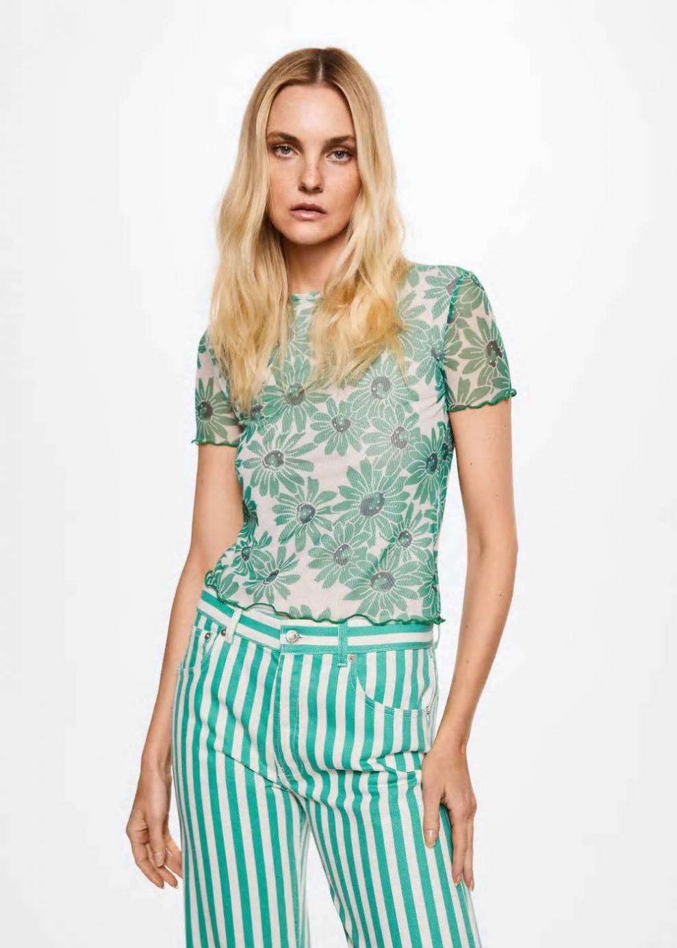 Tejido semitransparente Estampado de flores Diseño entallado Cuello redondo Manga corta Forro interior Terminaciones festoneadas