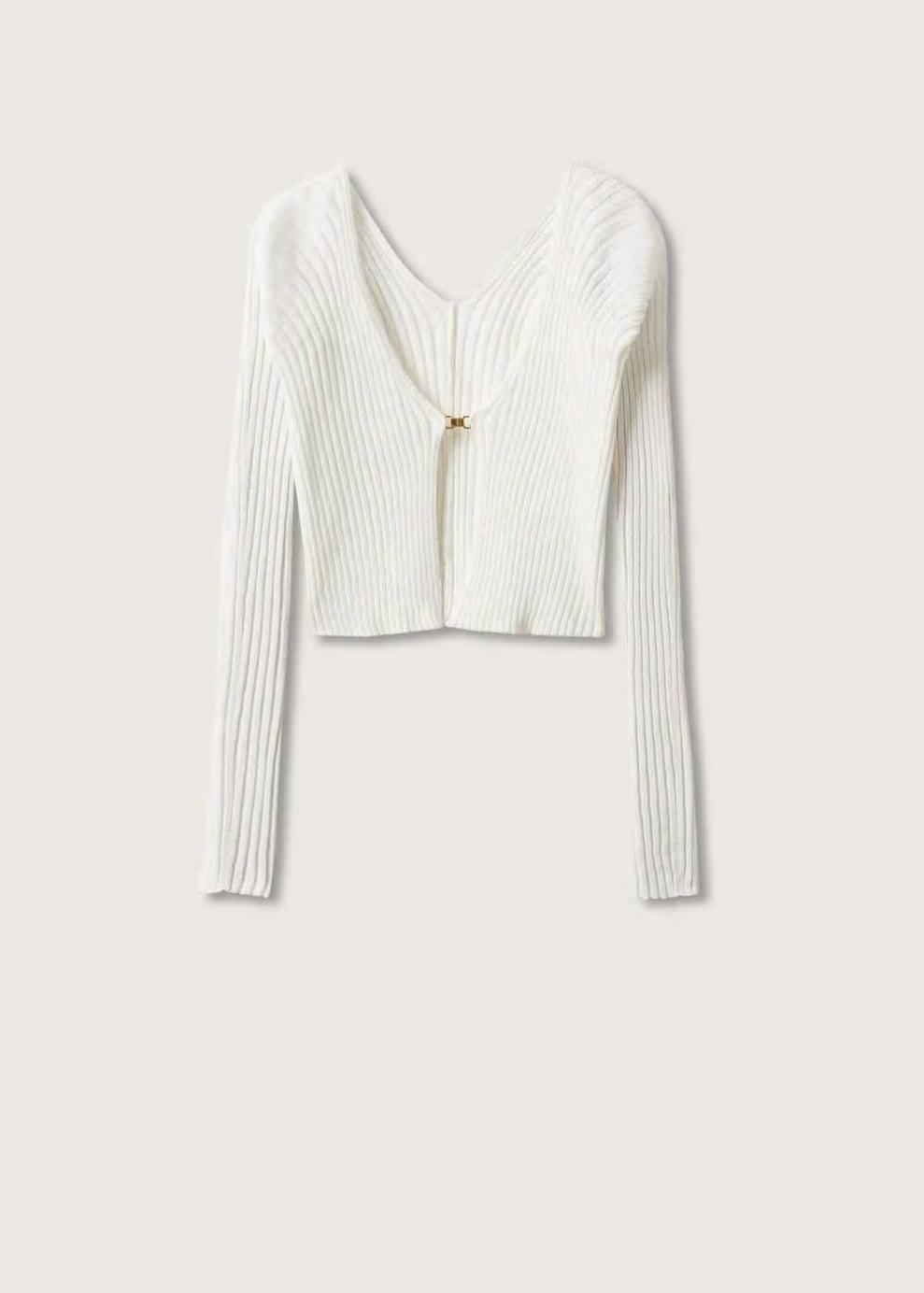 Tejido de punto fino Tejido de canalé Diseño crop Diseño entallado Cuello pico Manga larga Cierre delantero Cierre de clip metálico