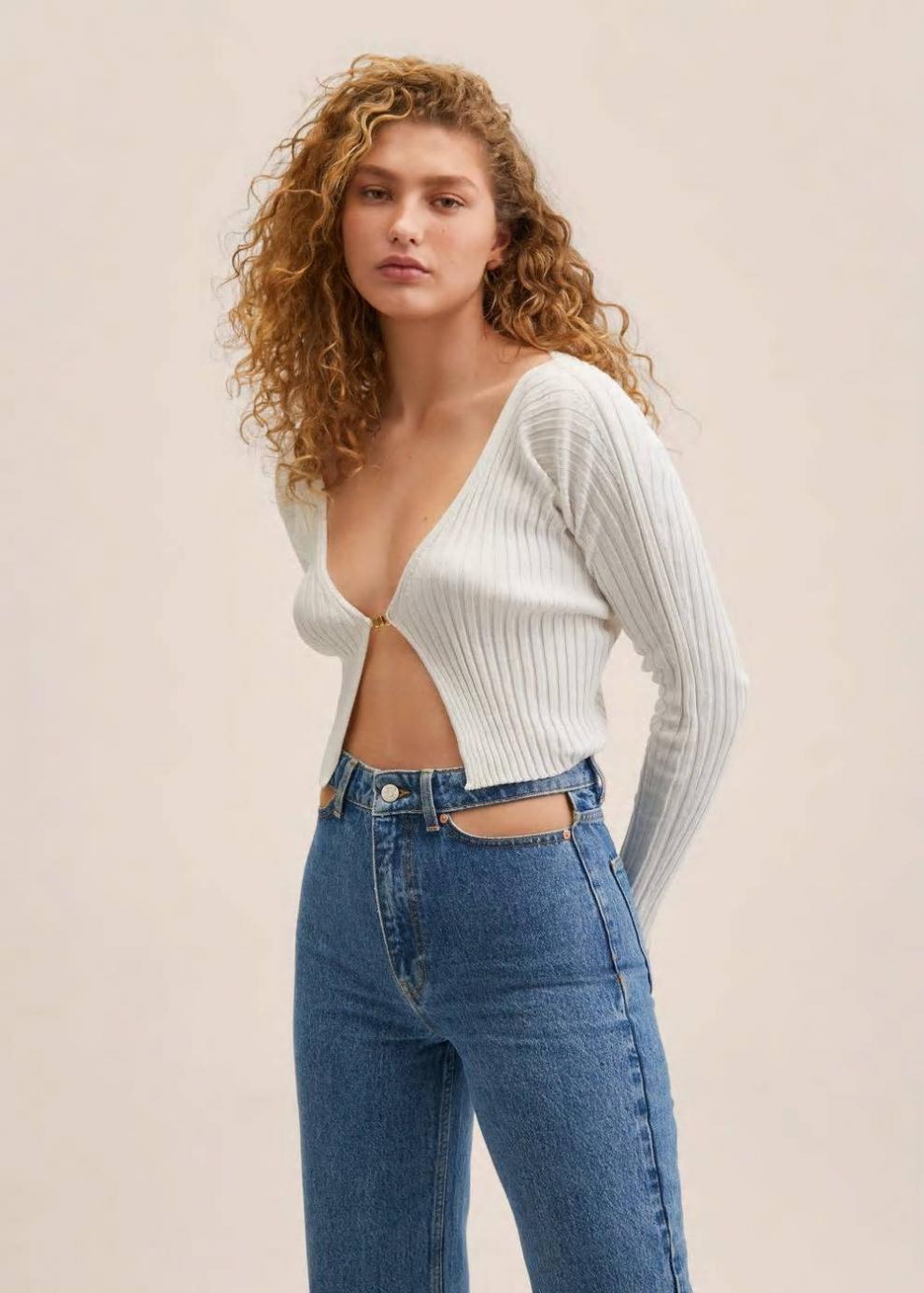 Tejido de punto fino Tejido de canalé Diseño crop Diseño entallado Cuello pico Manga larga Cierre delantero Cierre de clip metálico