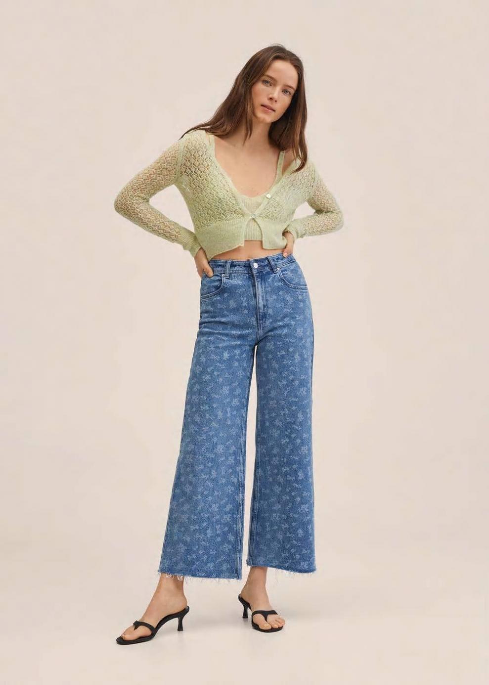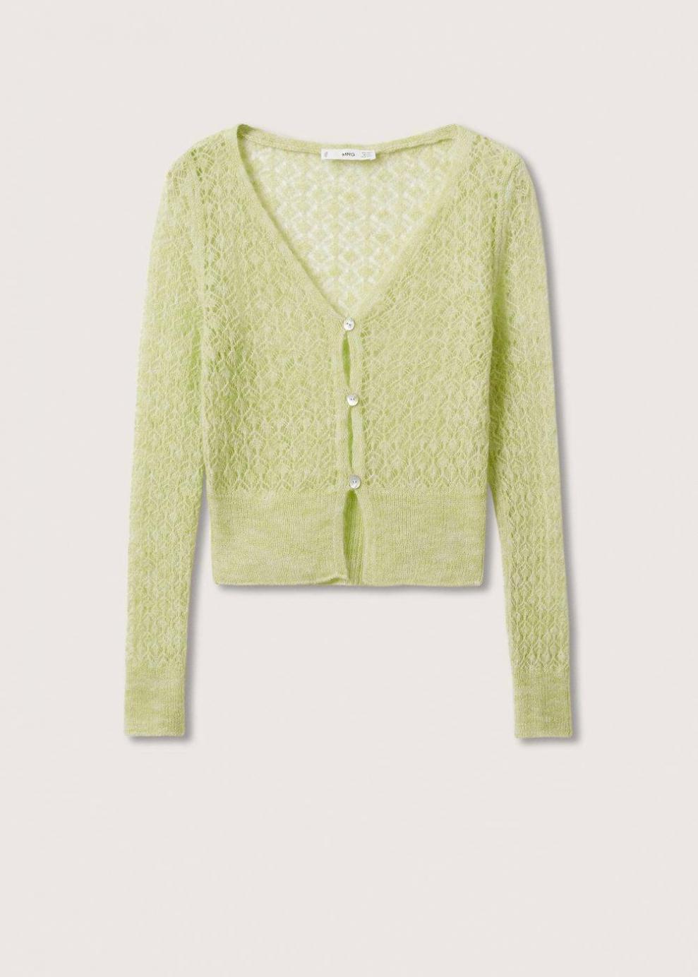 Tejido con lana Tejido de punto calado Terminaciones de canalé Diseño crop Diseño semitransparente Cuello pico Manga larga Cierre de botones en la parte delantera…