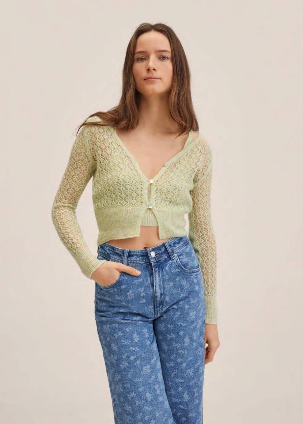Tejido con lana Tejido de punto calado Terminaciones de canalé Diseño crop Diseño semitransparente Cuello pico Manga larga Cierre de botones en la parte delantera