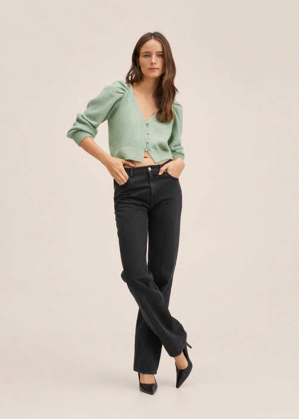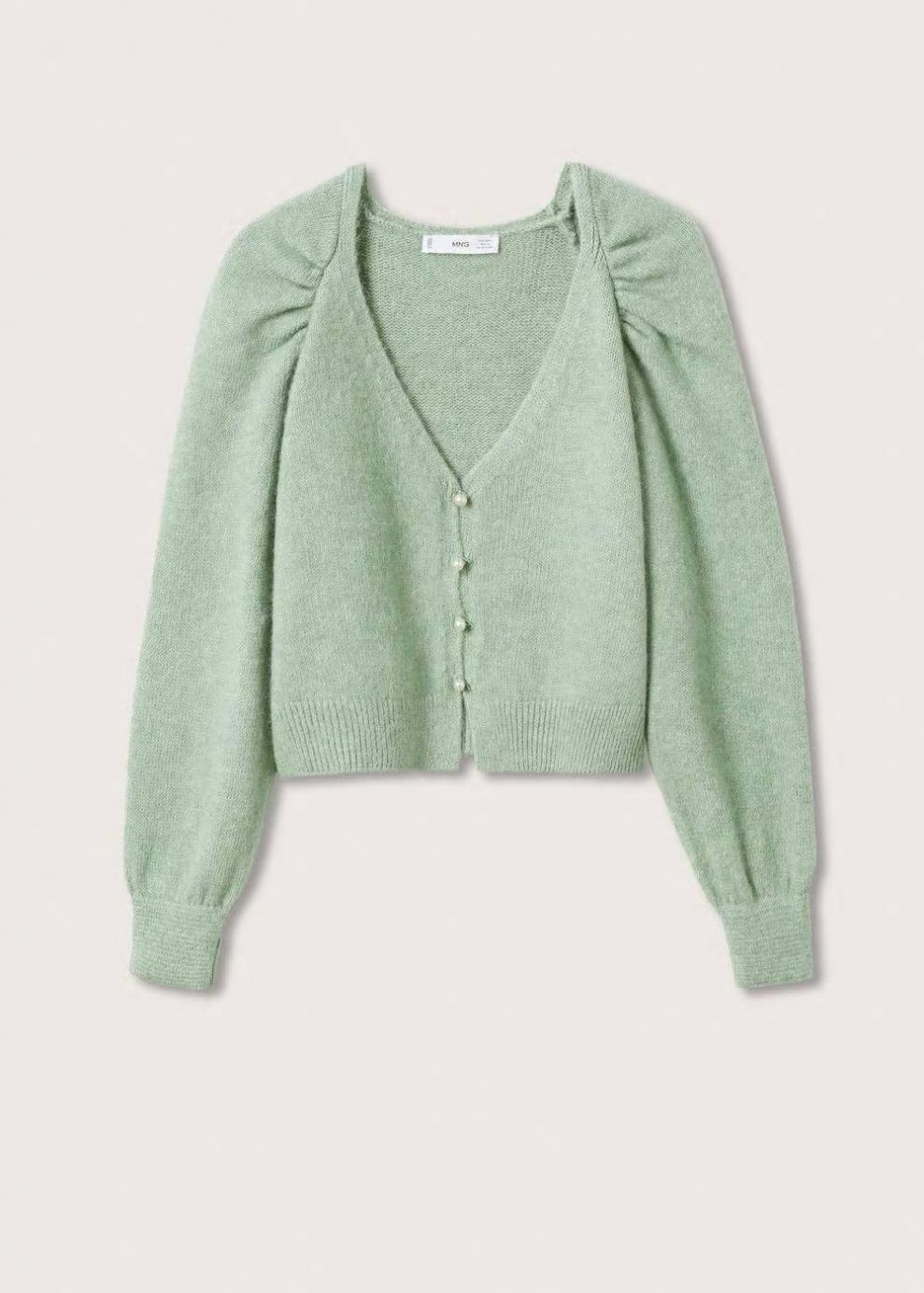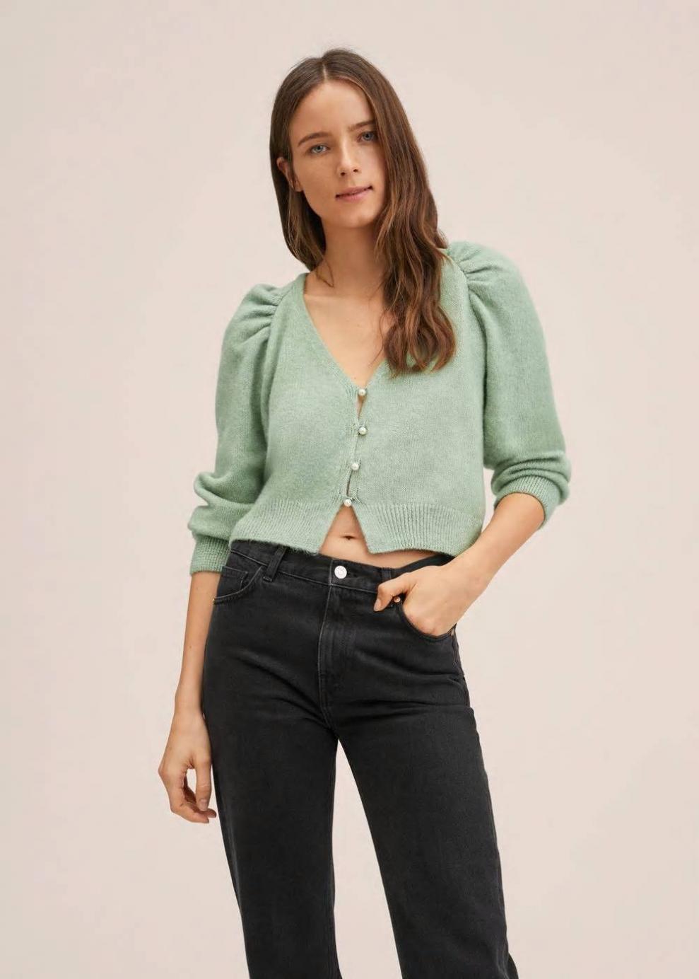 Tejido de punto Punto medio Cierre delantero Diseño crop Diseño recto Cuello pico Manga larga Detalle fruncido en la manga Cierre de botones de perla…