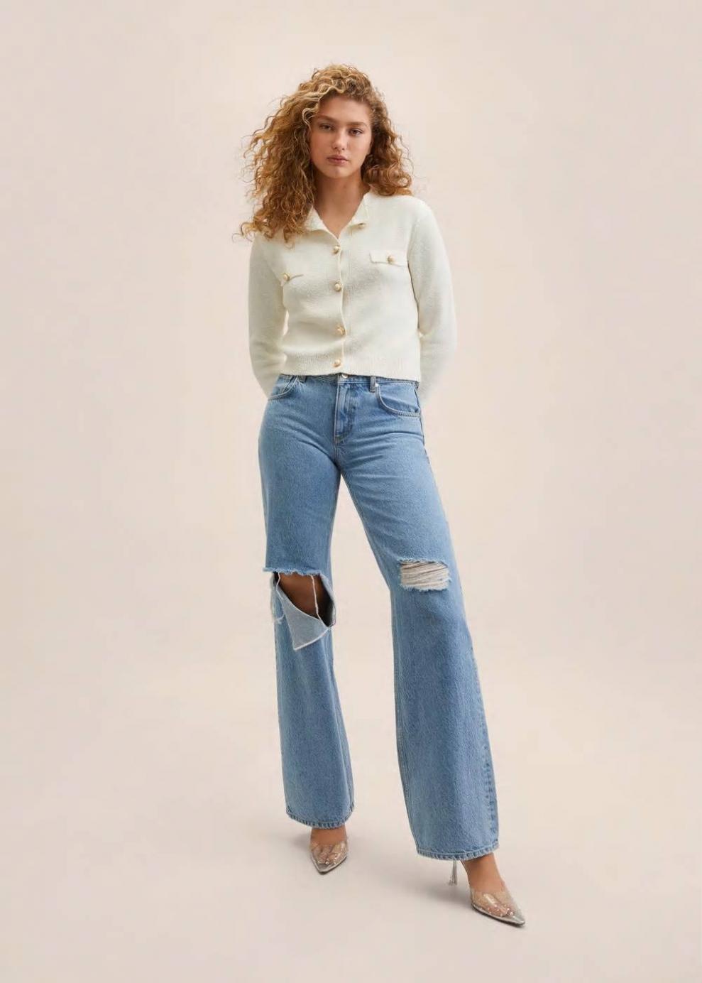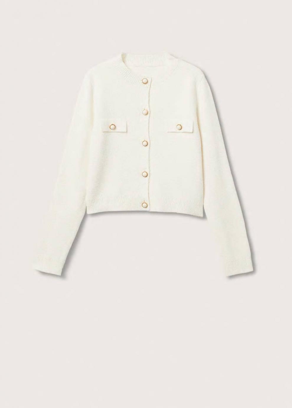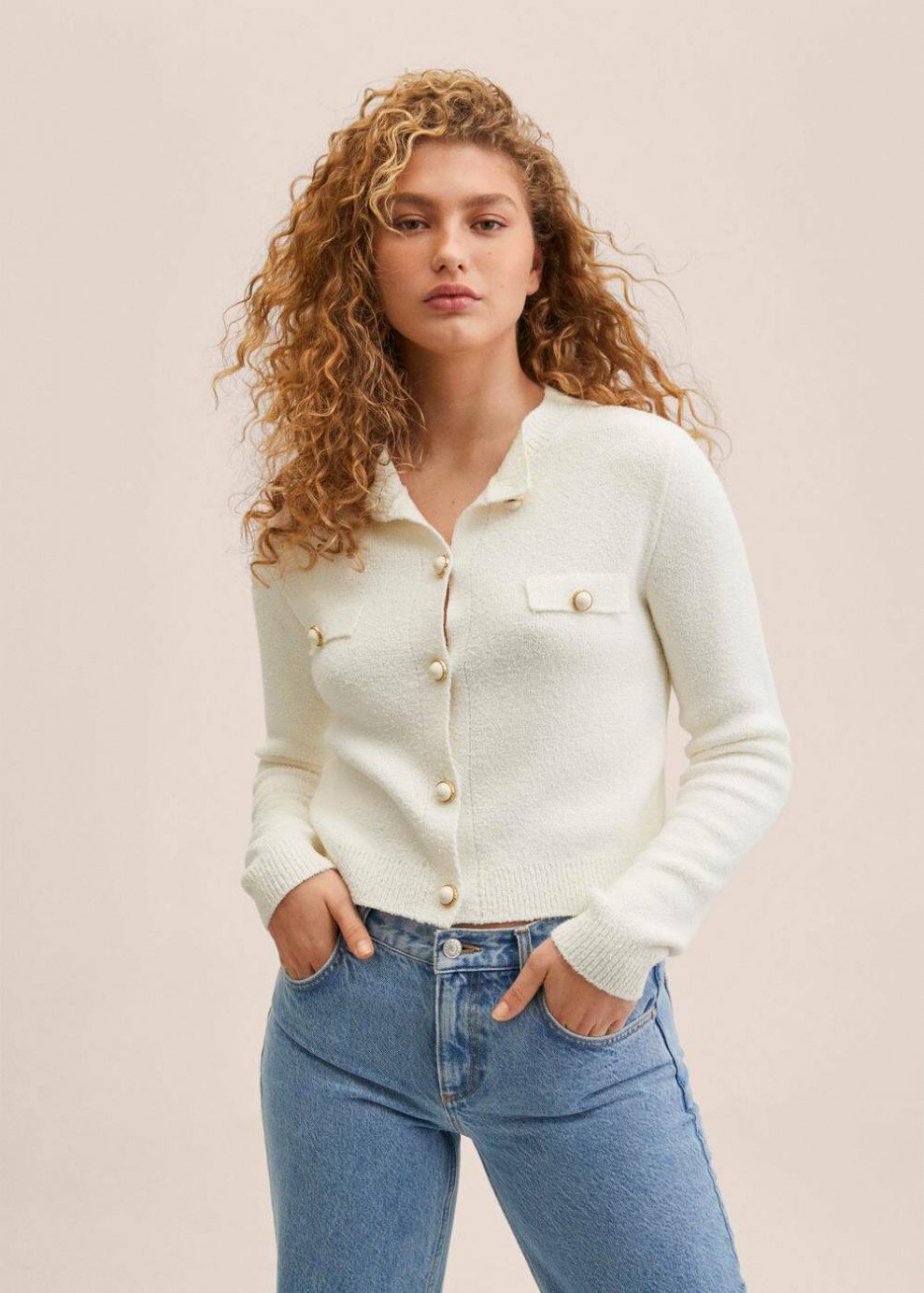 Tejido mezcla de algodón Tejido de punto Terminaciones en canalé Diseño recto Diseño corto Cuello redondo Manga larga Solapas decorativas parte delantera Botones efecto joya Cierre de botones en la parte delantera…