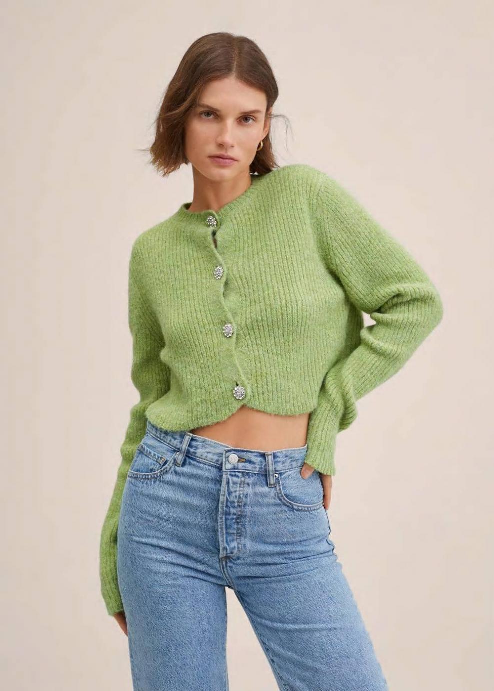 Tejido de punto Punto medio Cierre delantero Diseño recto Diseño crop Cuello redondo Manga larga Botones efecto joya Cierre de botones en la parte delantera
